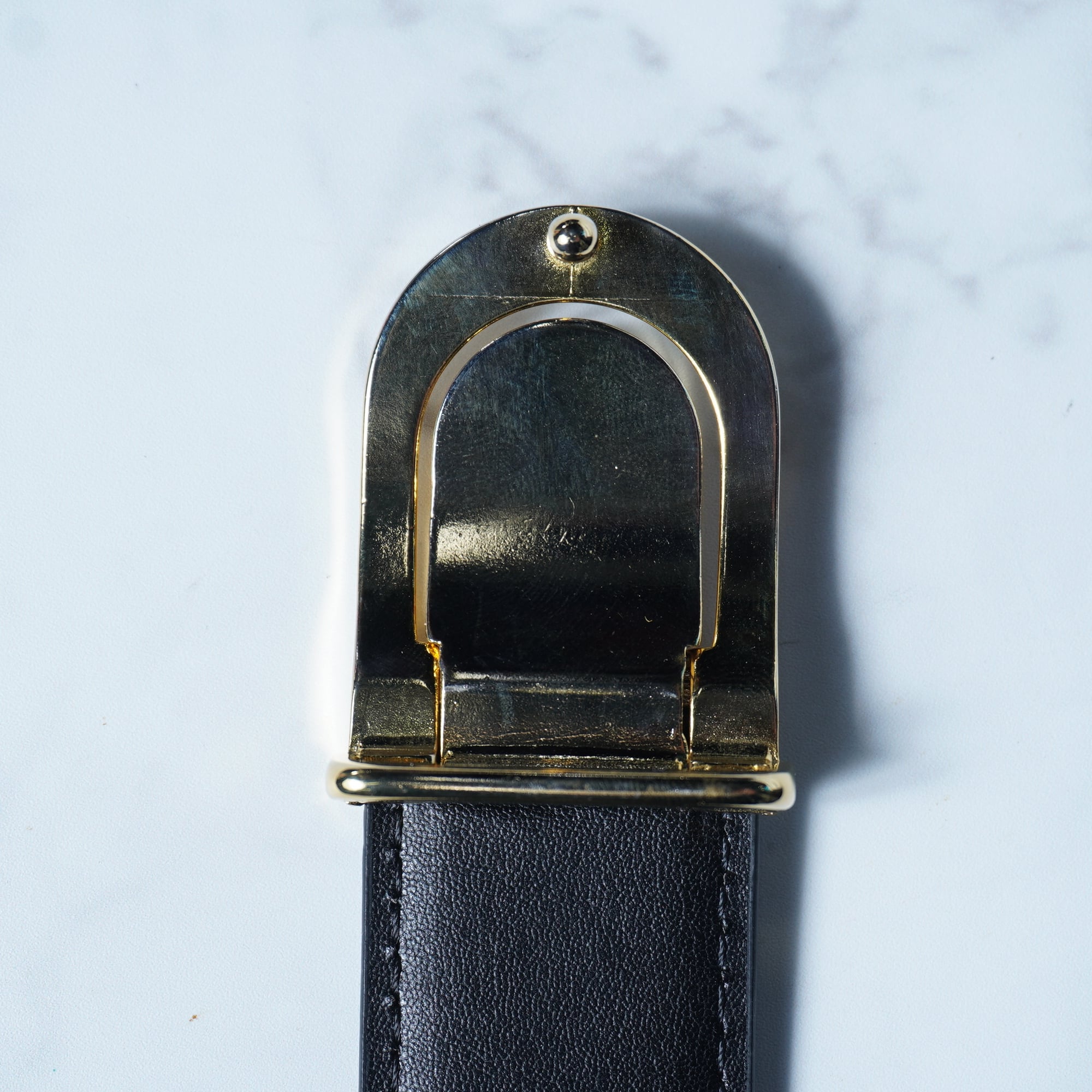 ・高級感漂うゴールドバックルがコーディネートに華やかさをプラス