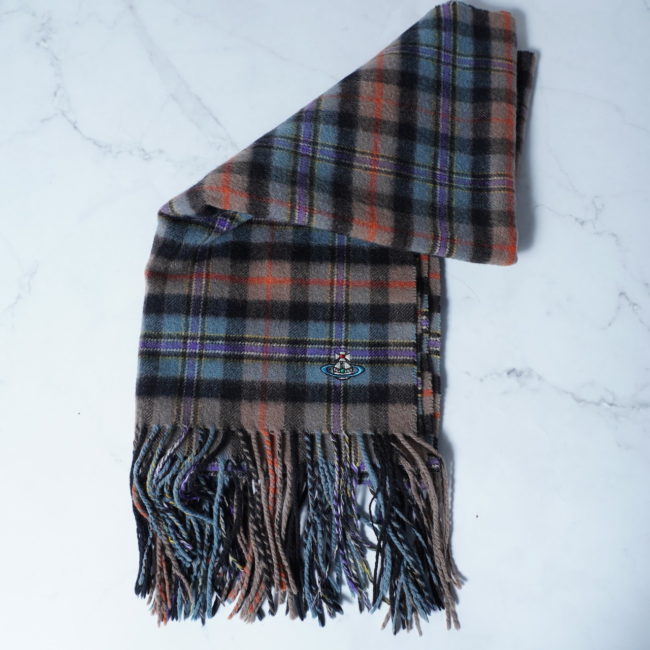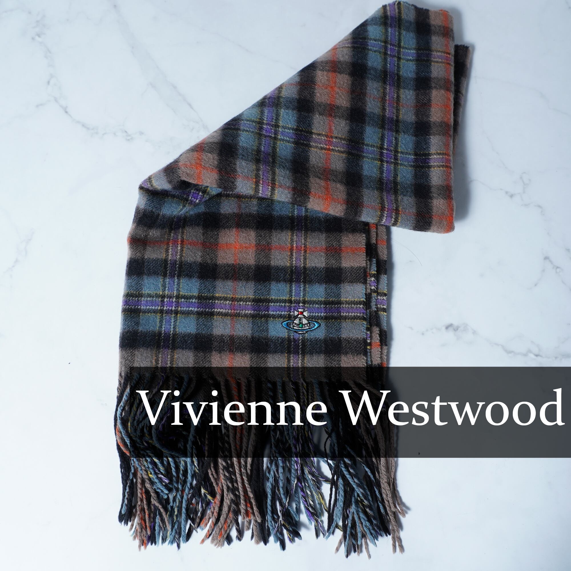 【Vivienne Westwood】ヴィヴィアンウエストウッド オーブロゴ刺繍 チェック柄カシミヤマフラー purple&brown&black