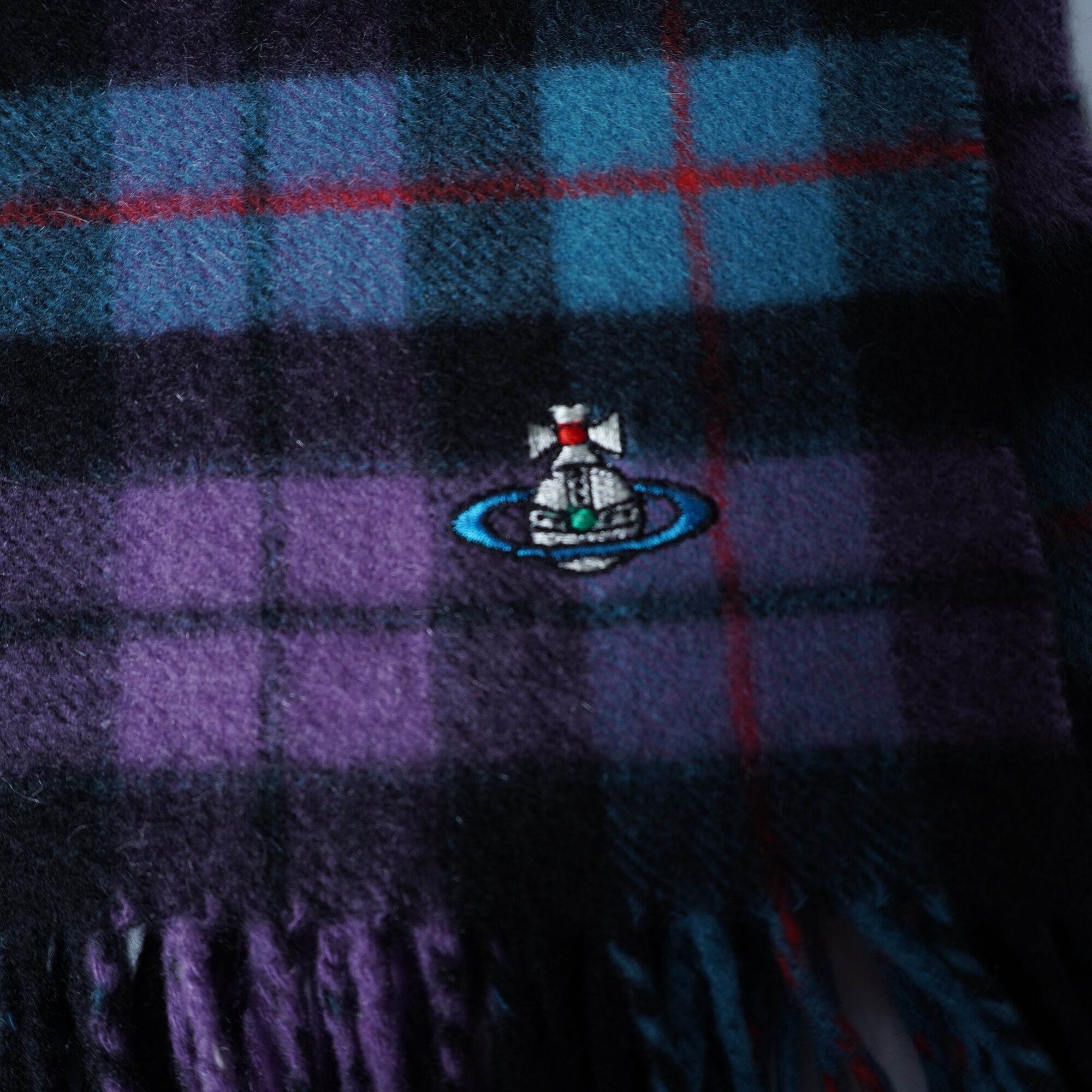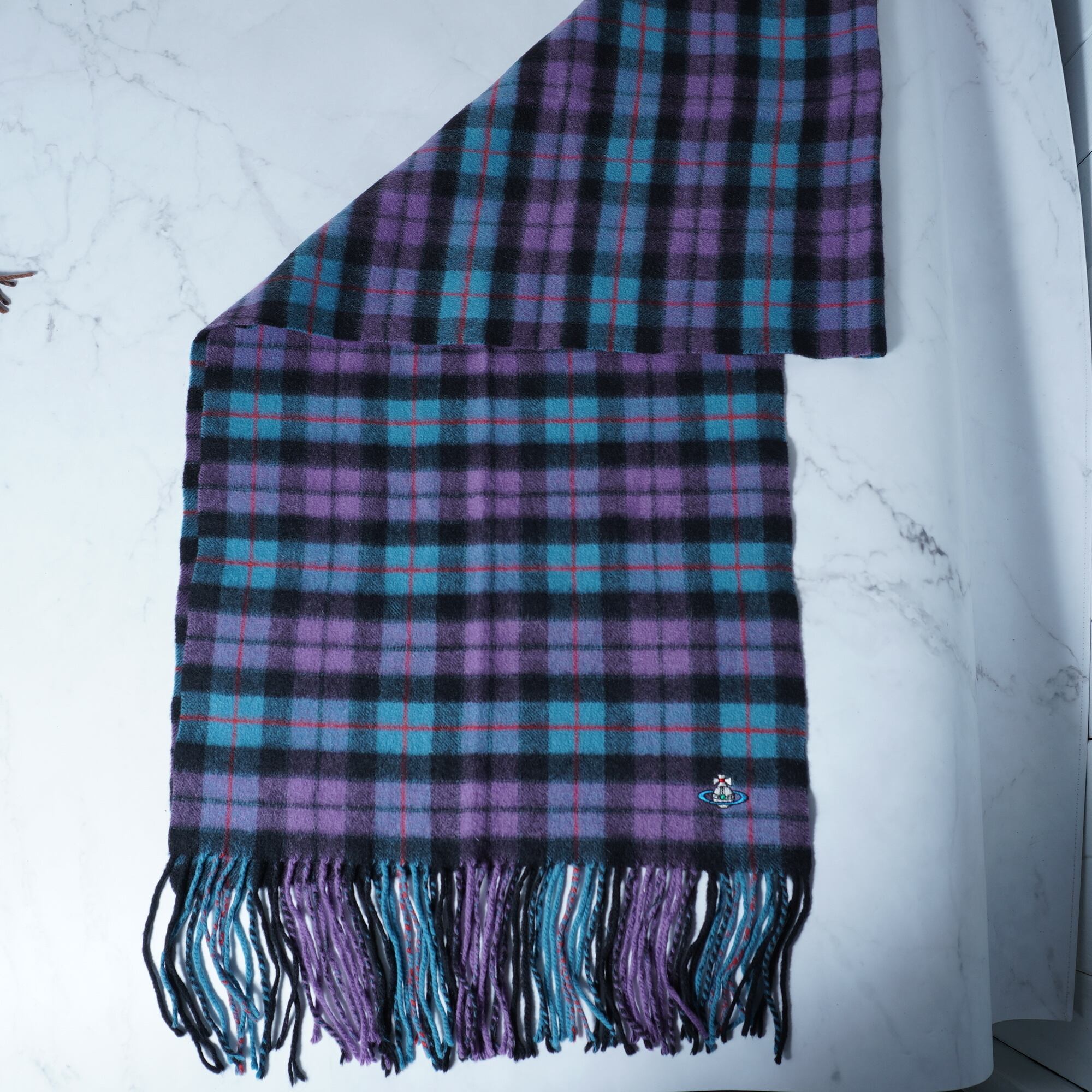 【Vivienne Westwood】ヴィヴィアンウエストウッド オーブロゴ刺繍 タータンチェックカシミアマフラー purple&black&red