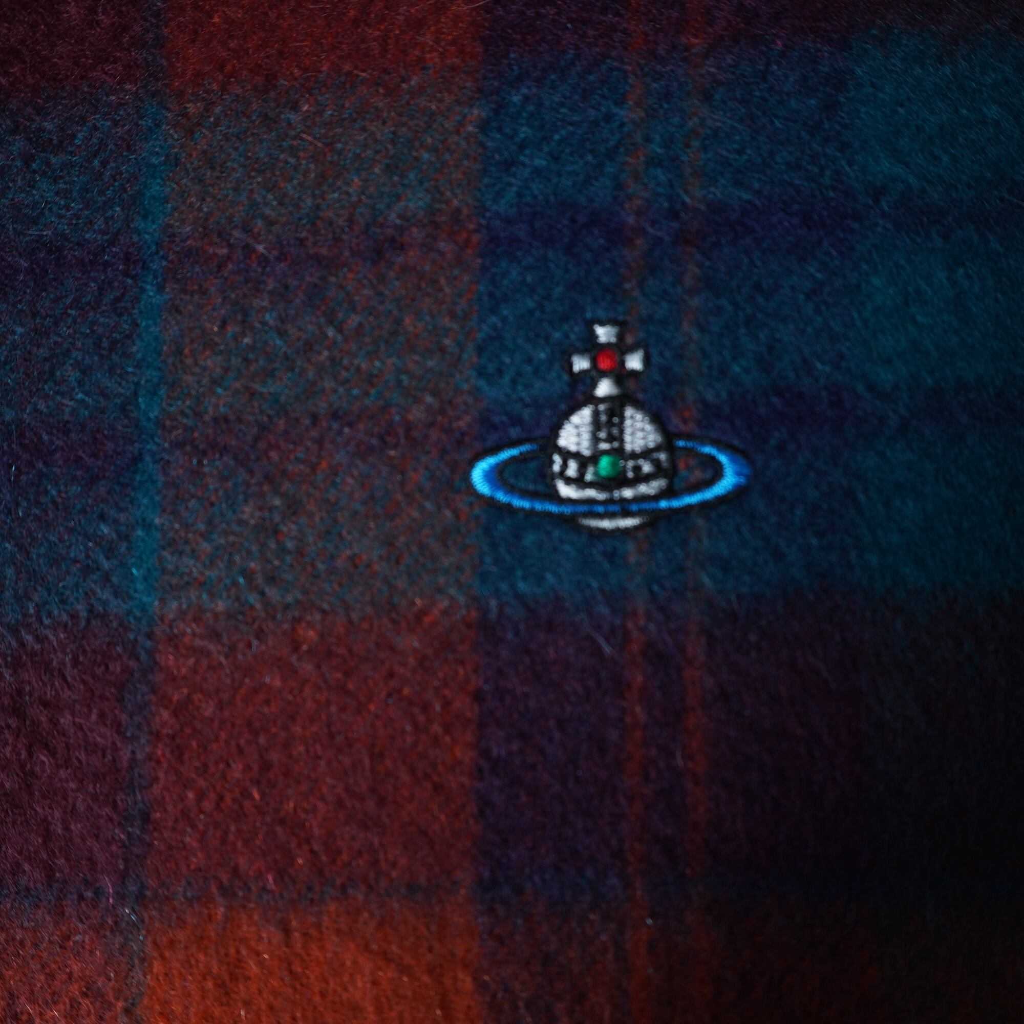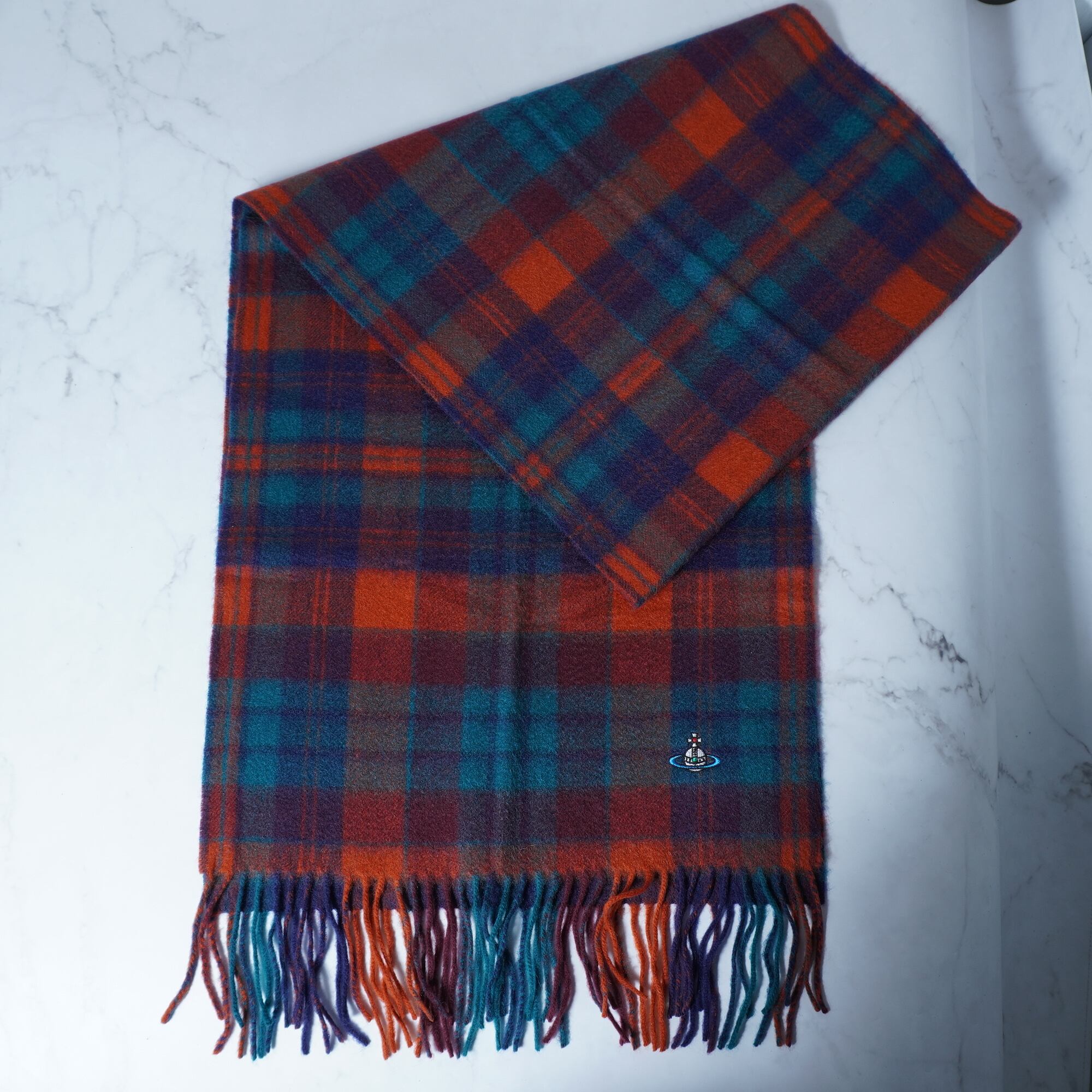 【Vivienne Westwood】ヴィヴィアンウエストウッド オーブロゴ刺繍 チェック柄カシミアマフラー orange&green