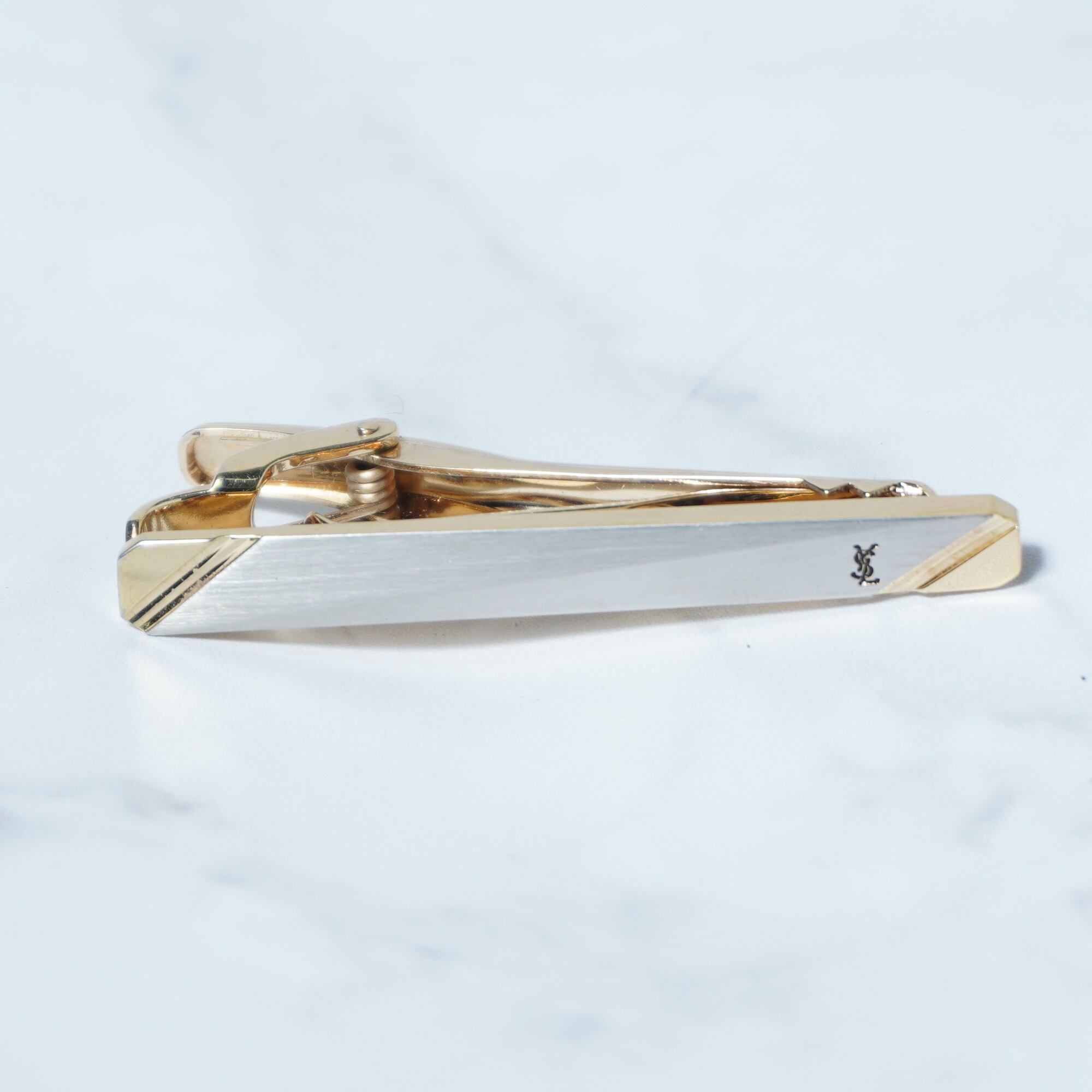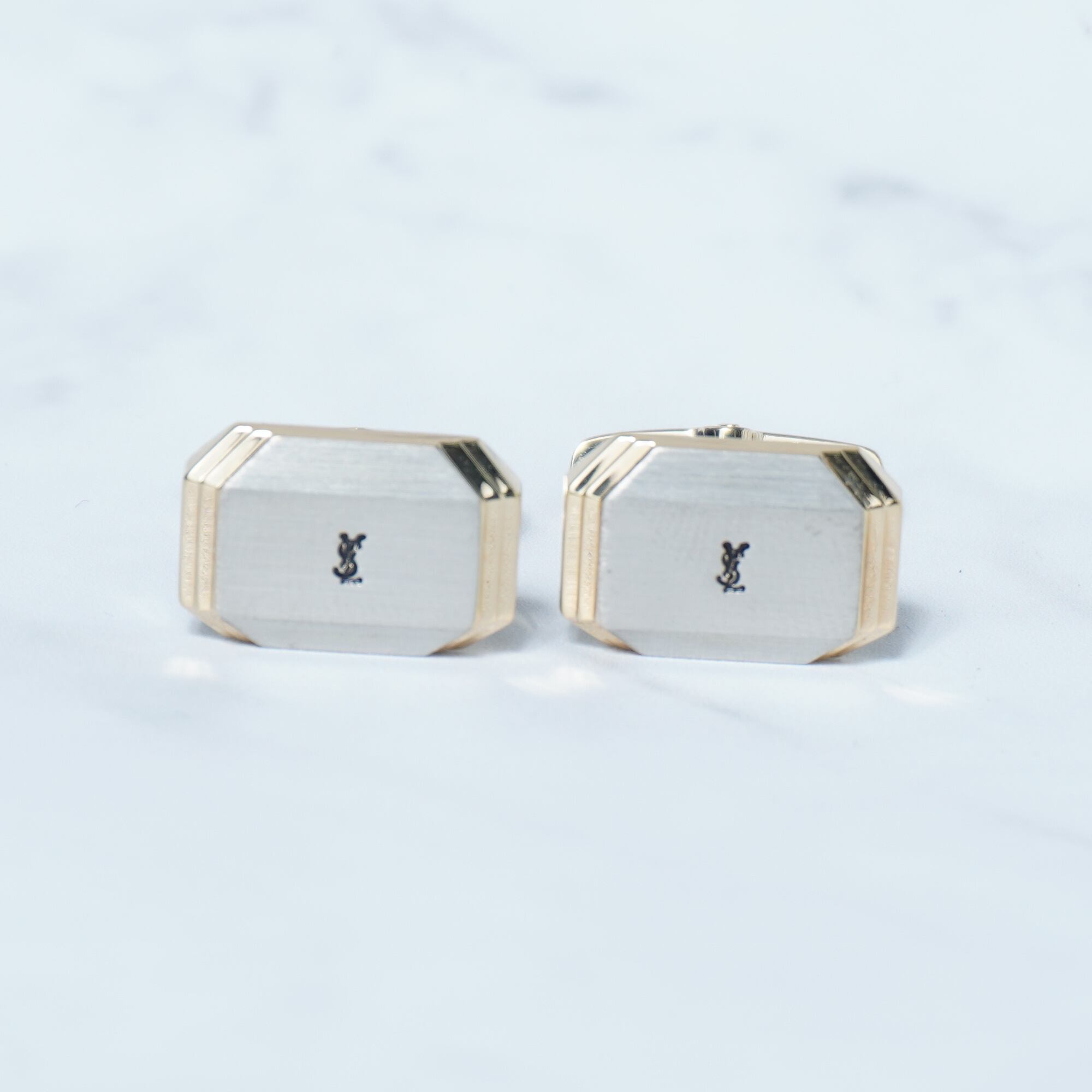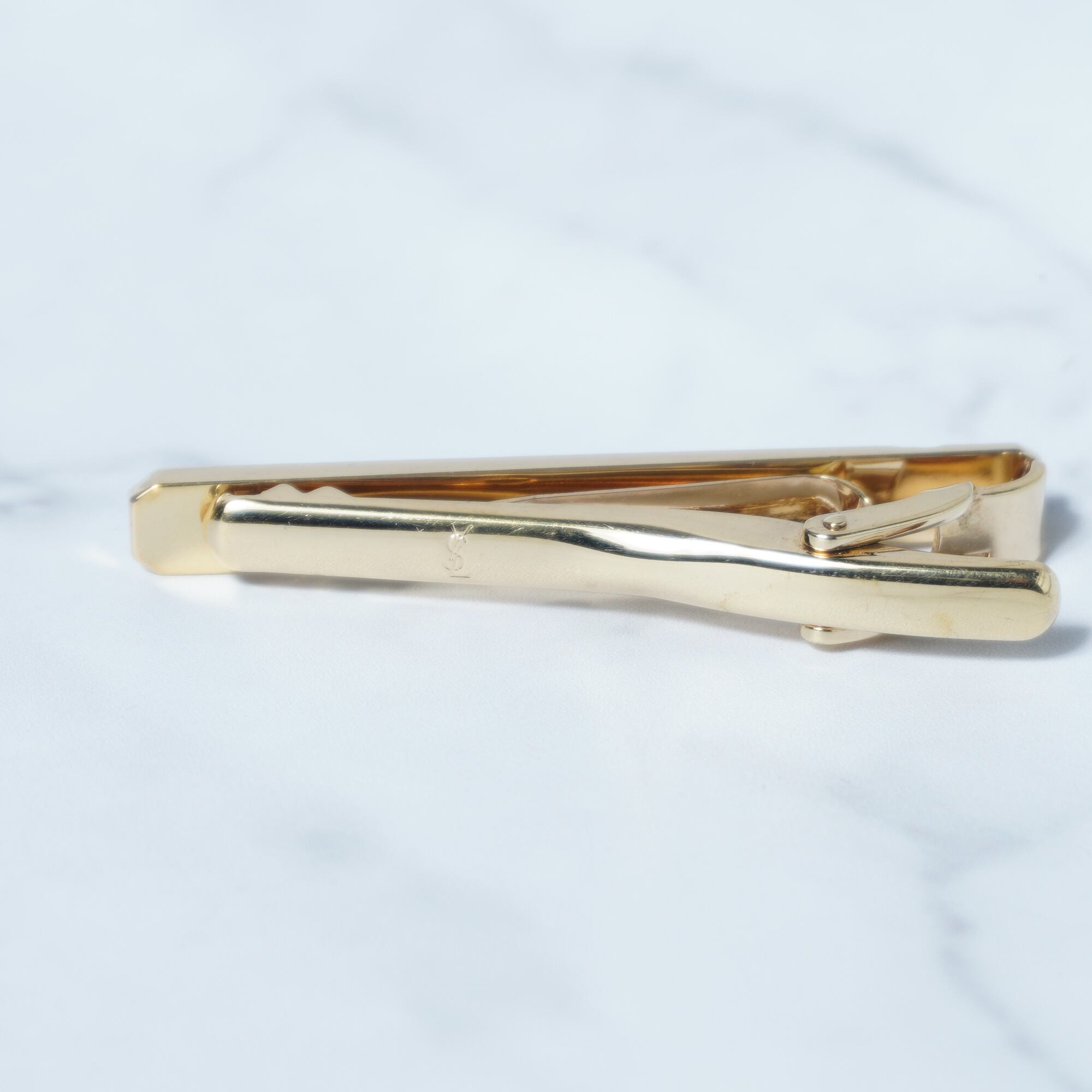 Yves Saint Laurentの洗練されたネクタイピンとカフスピンのセットは、ビジネスシーンや特別な日のお洒落を引き立てます。エレガントなゴールドの仕上げに、アイコニックなYSLロゴが施され、シンプルながらも存在感のあるアクセサリーです。箱付きでの提供となりますので、大切な方へのギフトにも最適です。
