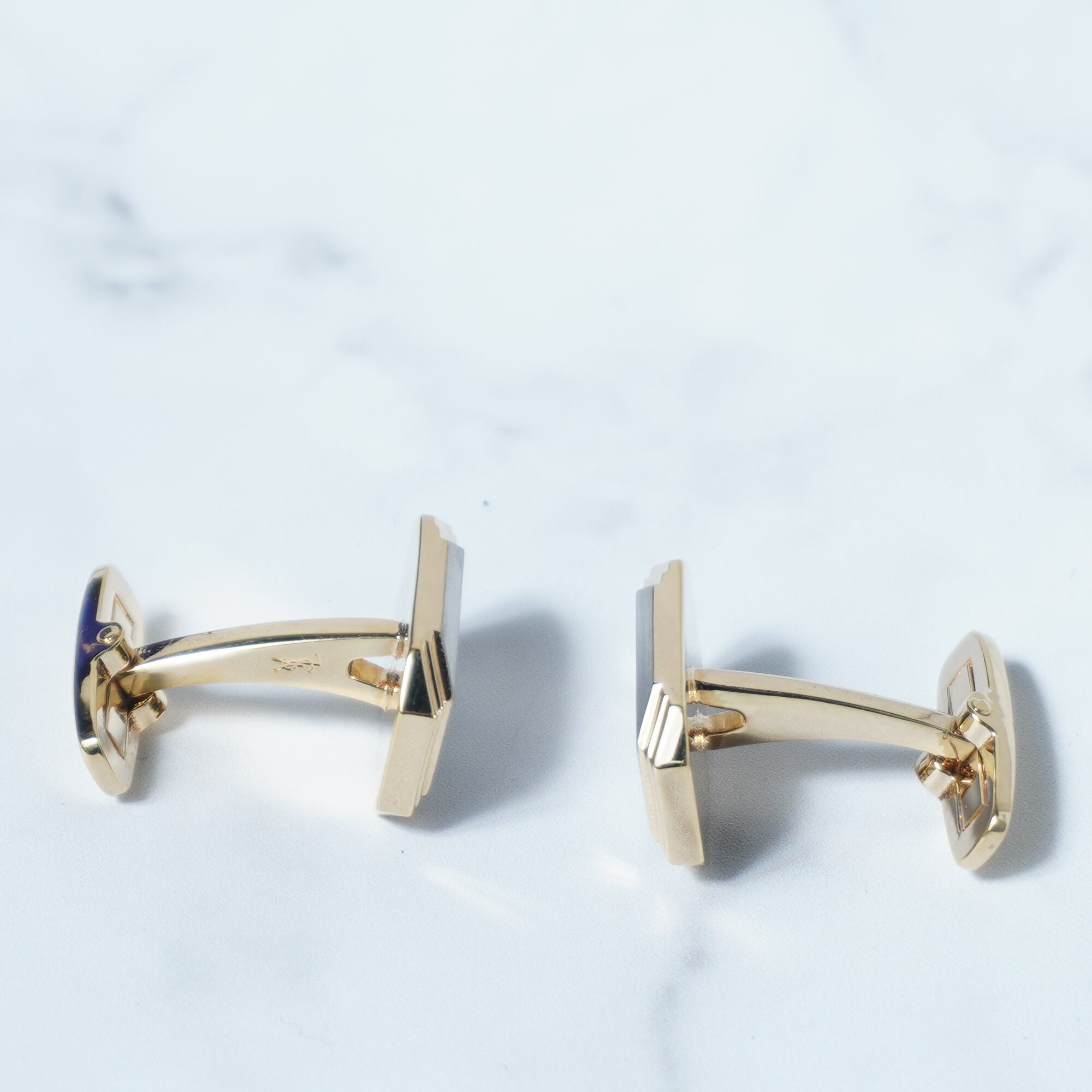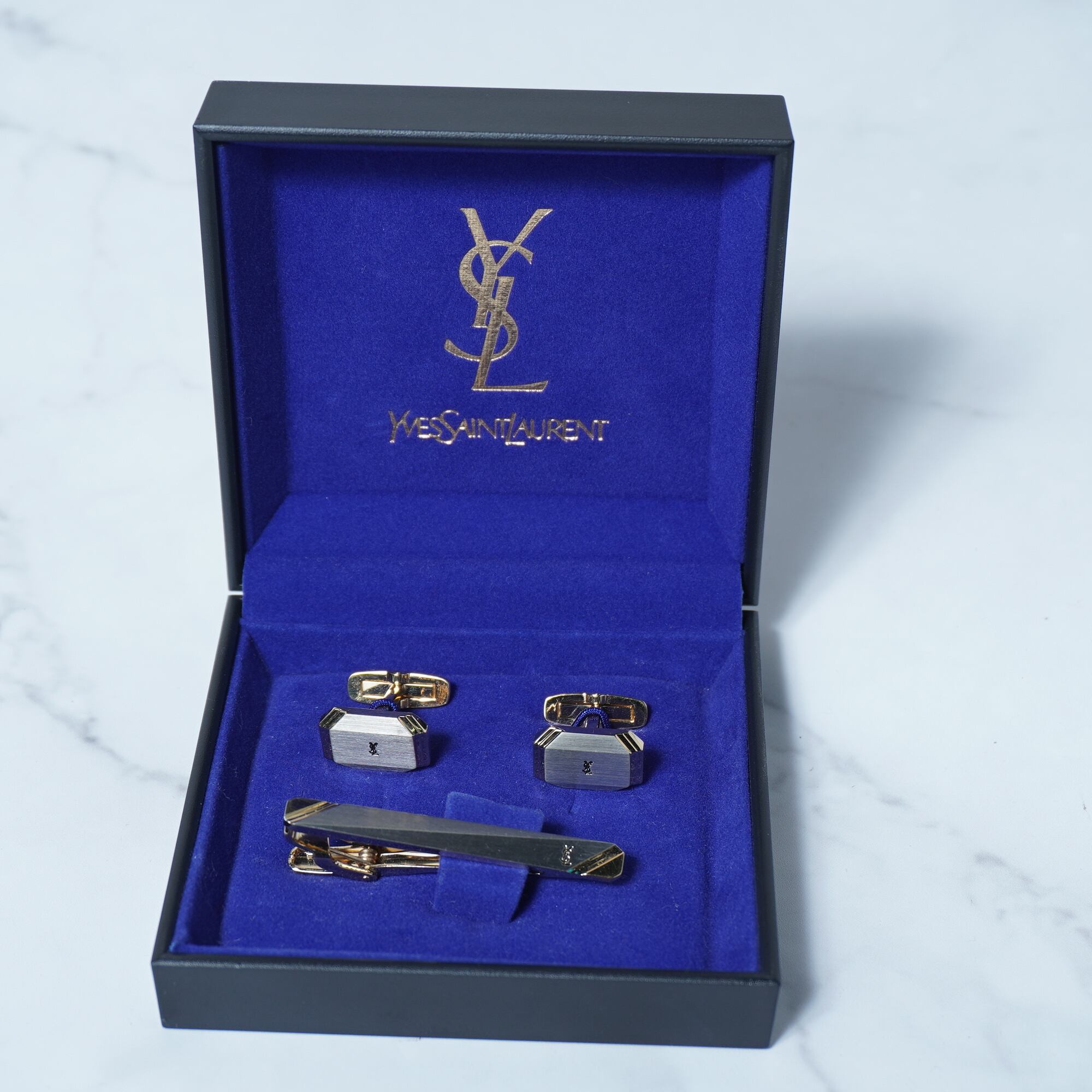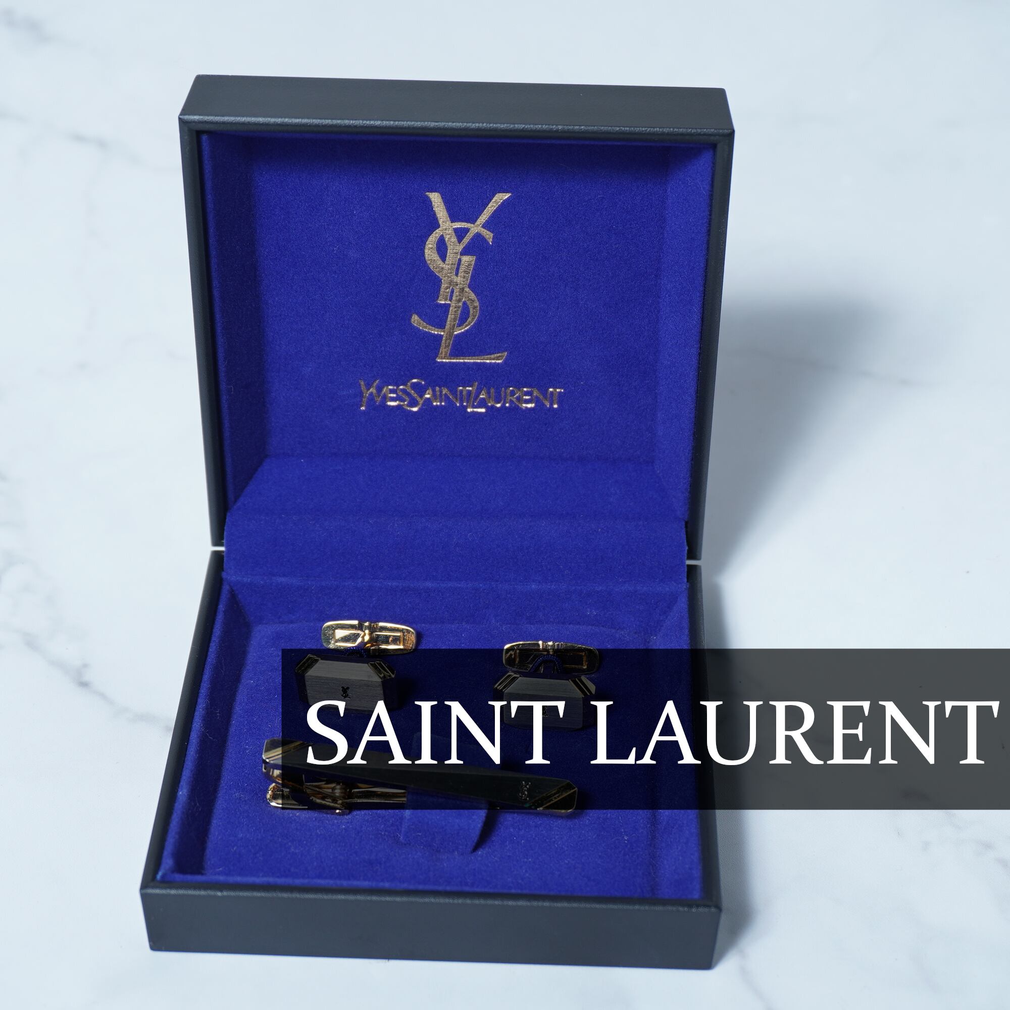 【Yves Saint Laurent】イブサンローラン ブラックバックルYSLロゴ ネクタイピン カフスピンセット 箱付き gold