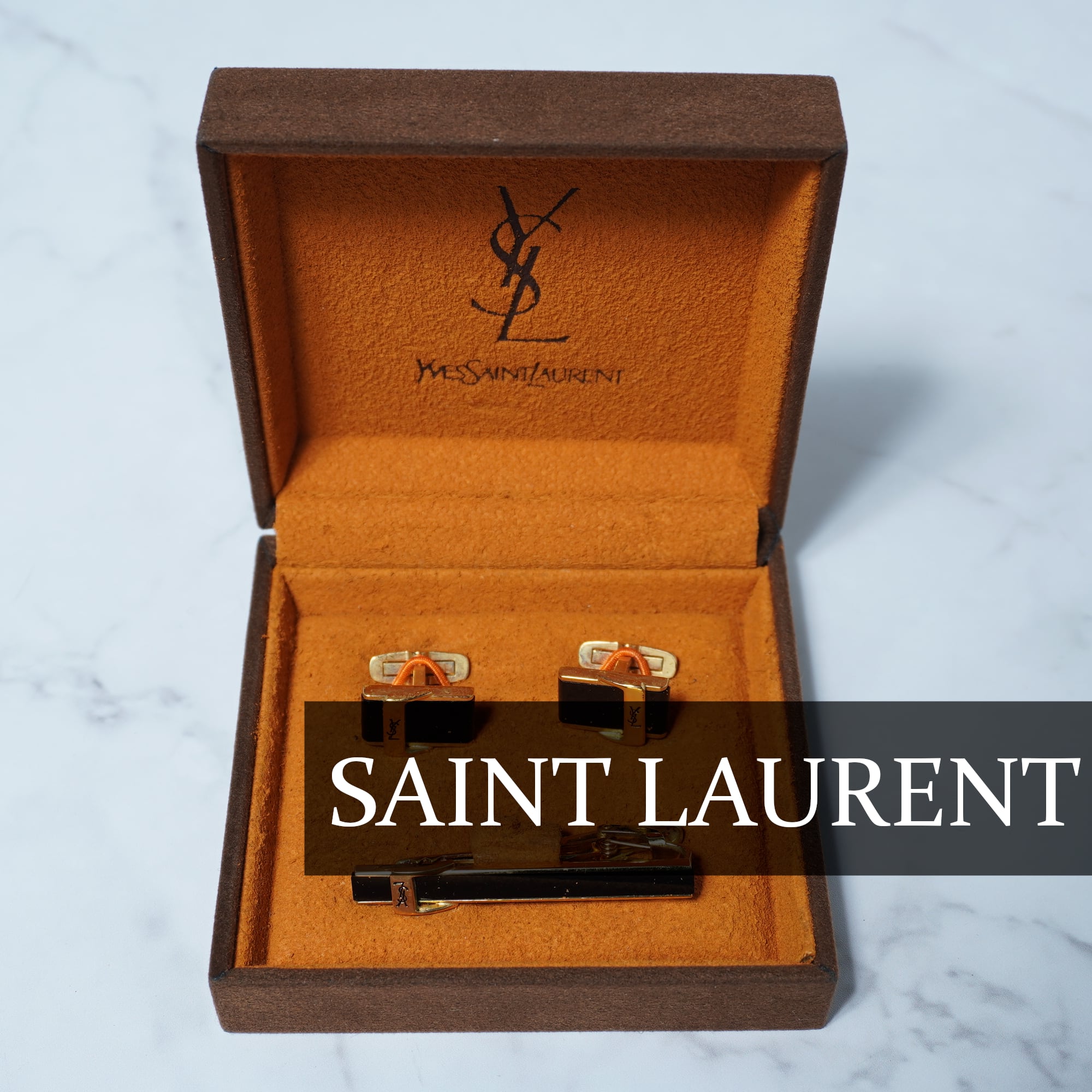 【Yves Saint Laurent】イブサンローラン YSLロゴ ネクタイピン・カフスピンセット 箱付き gold&black