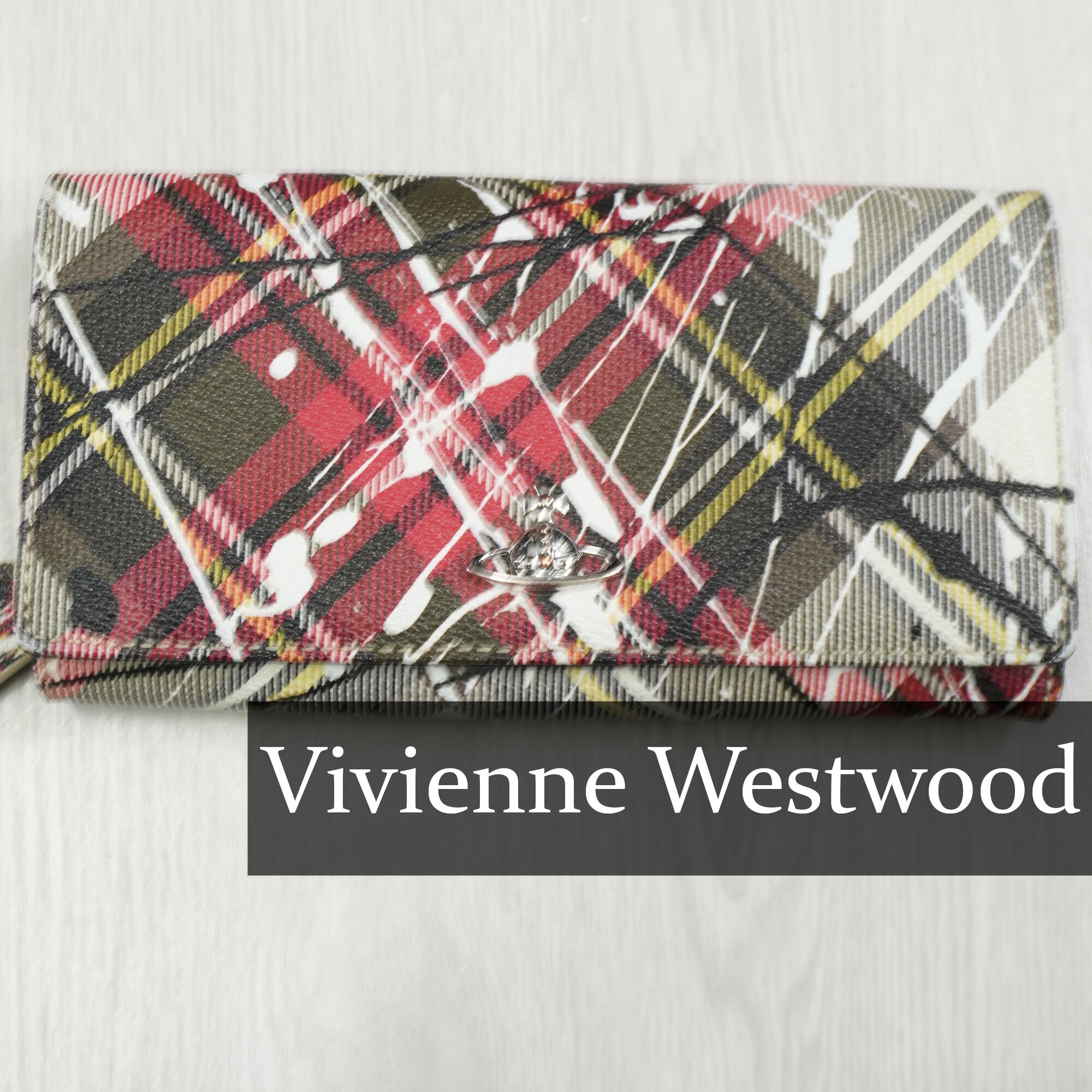 【Vivienne Westwood】ヴィヴィアンウエストウッド オーブモチーフペンキグラフィックチェック柄フラップ長財布 red