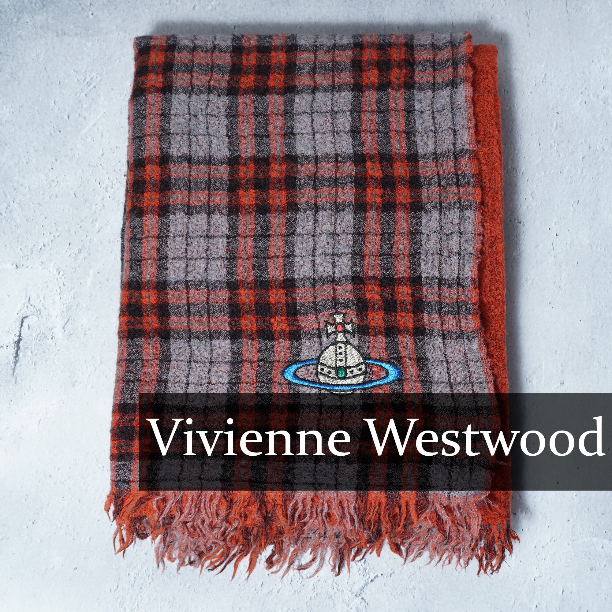 【Vivienne Westwood】ヴィヴィアンウエストウッド WOOL100%オーブロゴ刺繍チェック柄ストール orange&gray&black