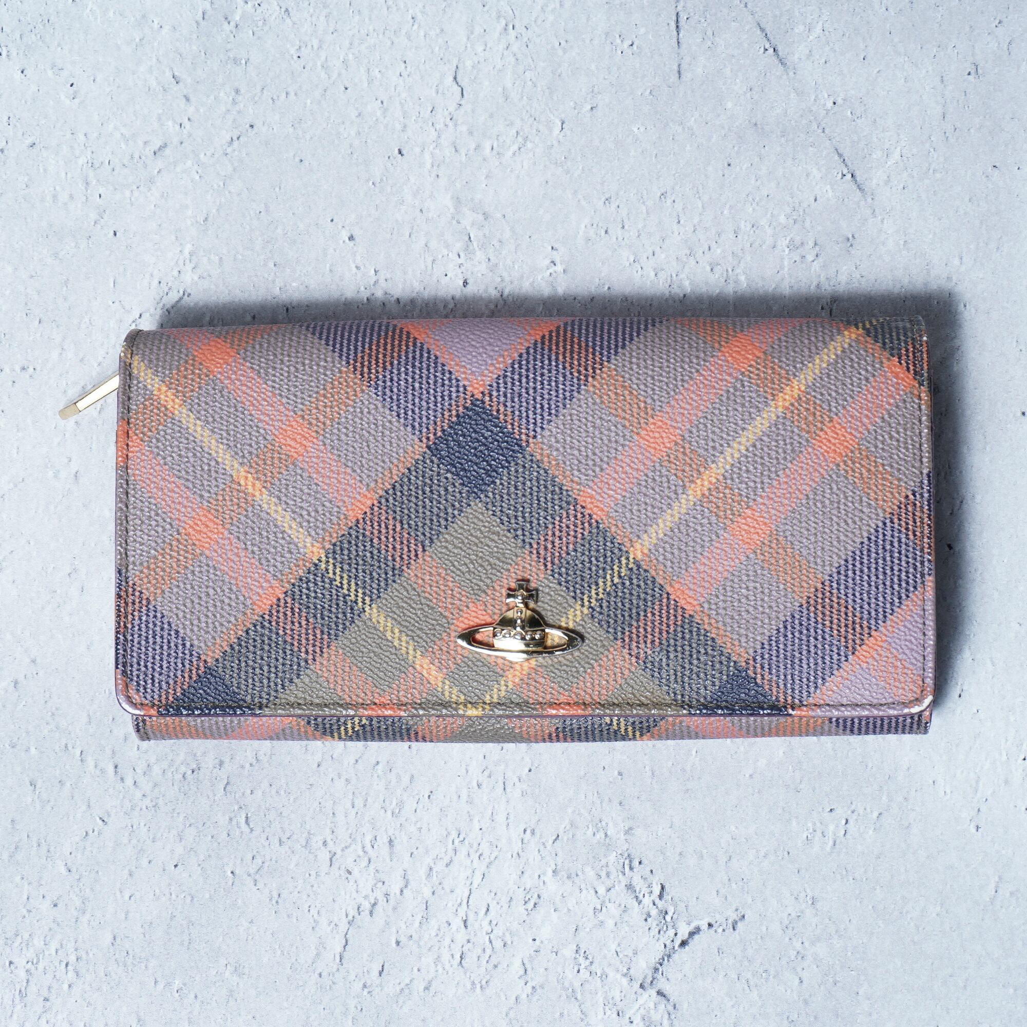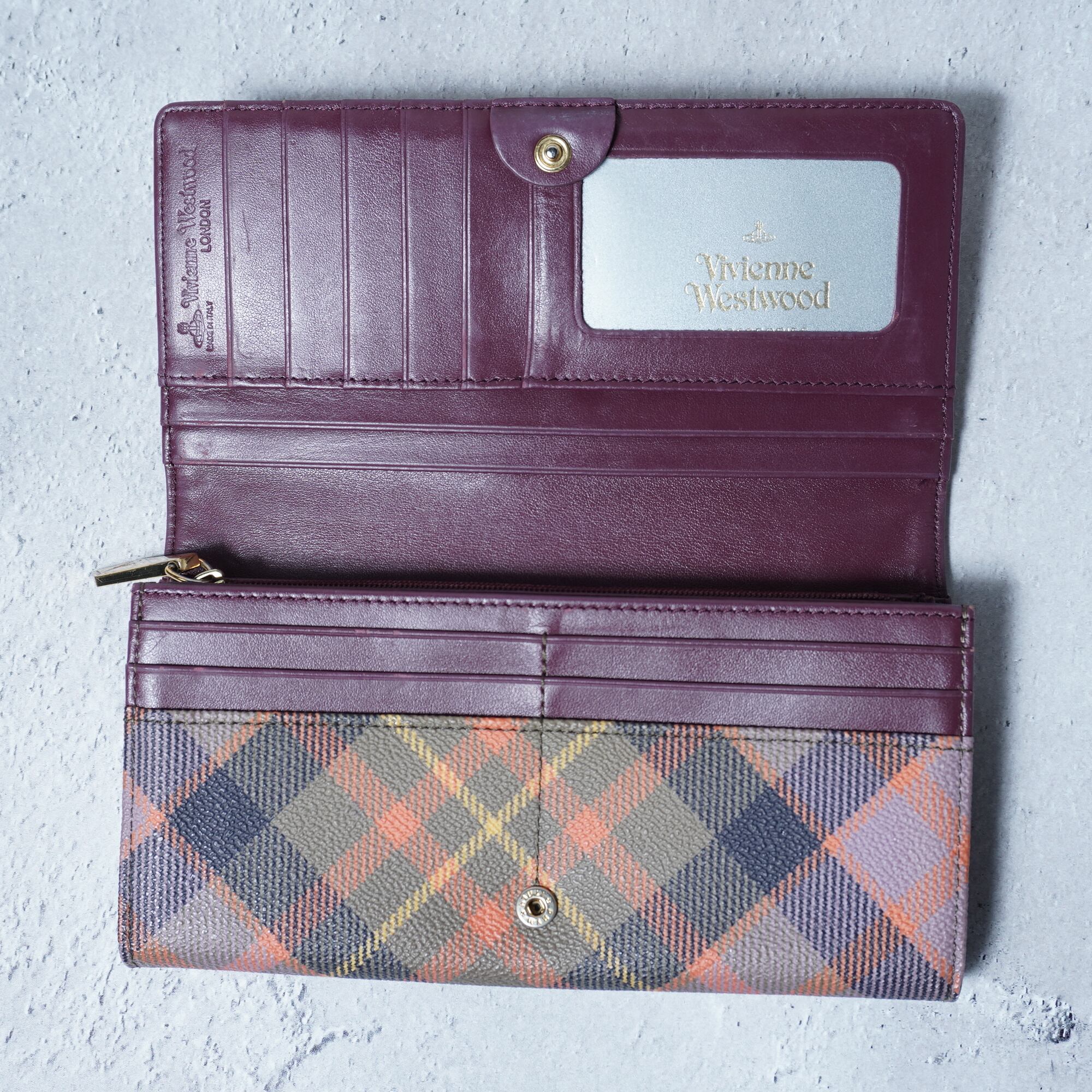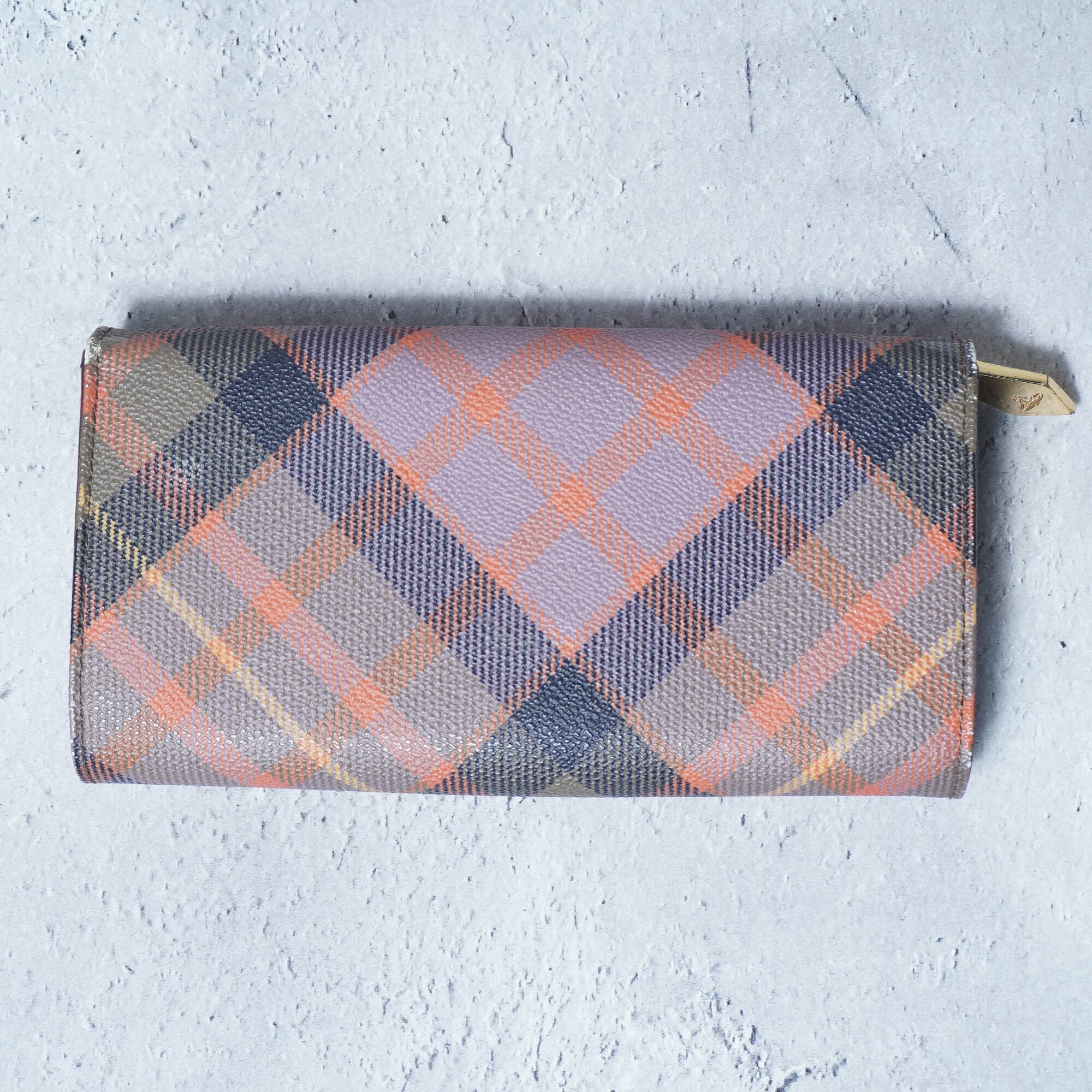 【Vivienne Westwood】ヴィヴィアンウエストウッド オーブロゴ チェック柄レザーロングウォレット orange&purple&yellow