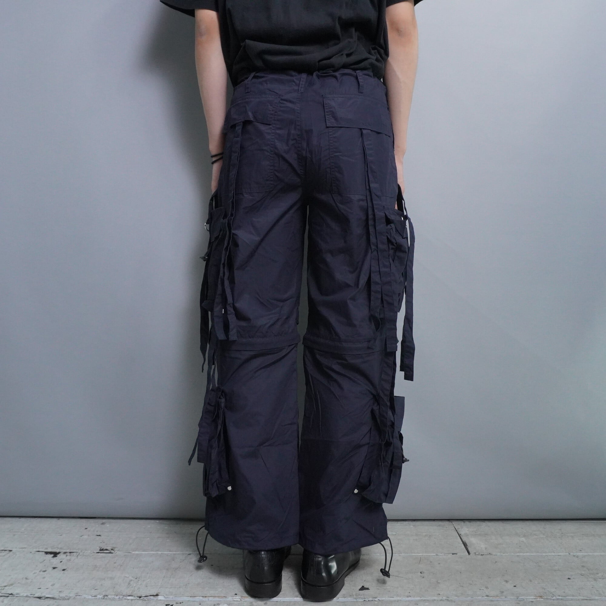 無数に垂れ下がった紐とワイドなシルエットが非常に特徴的なパンツで、素材はポリエステルとコットンの混紡素材。