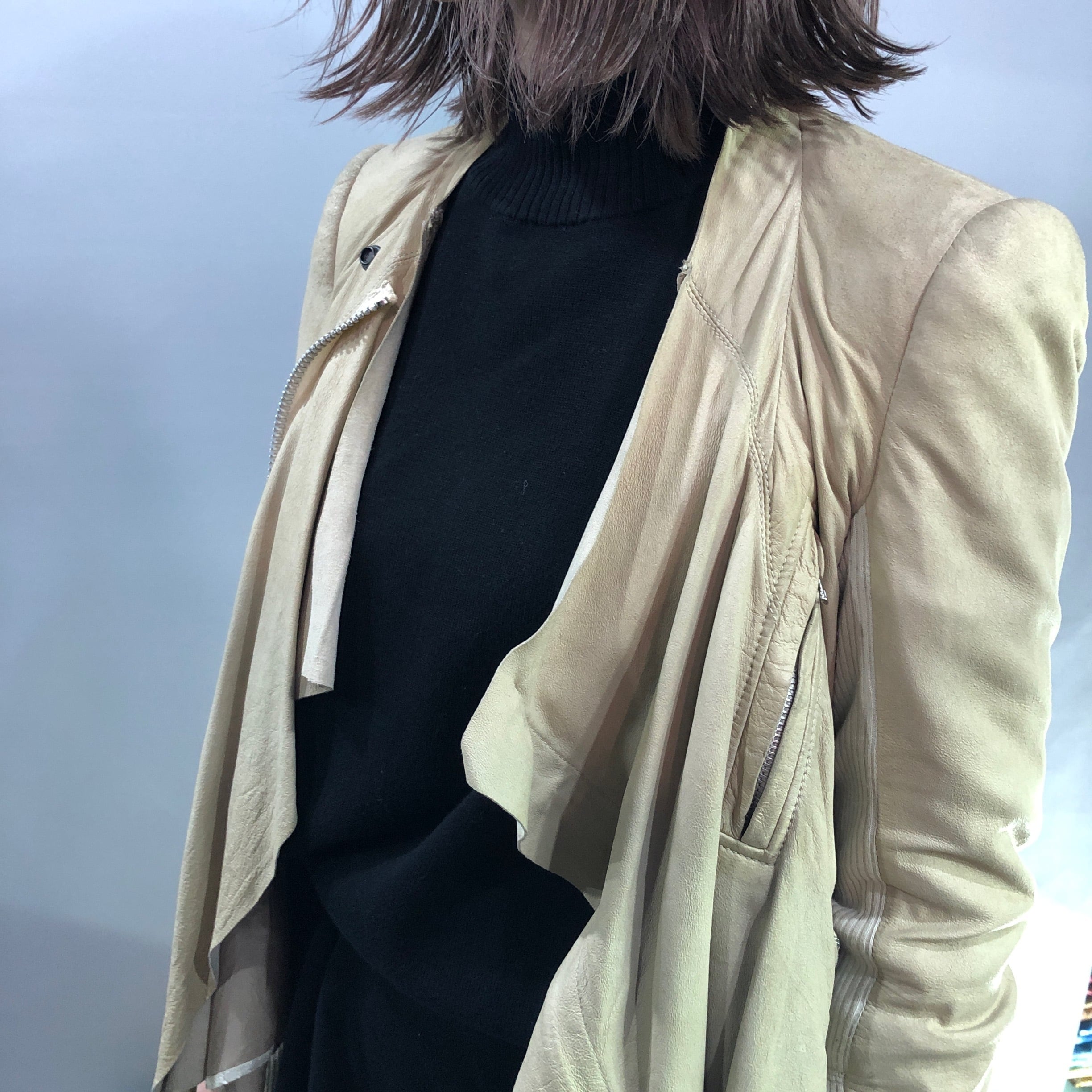 羽織るだけで自然とドレープが出るレザージャケット。女性らしいタイトなサイジングでボトムスを選びません。使いやすいベージュカラーでレザーの力強さが緩和された黄金バランスは日常に取り入れやすい極上品です。