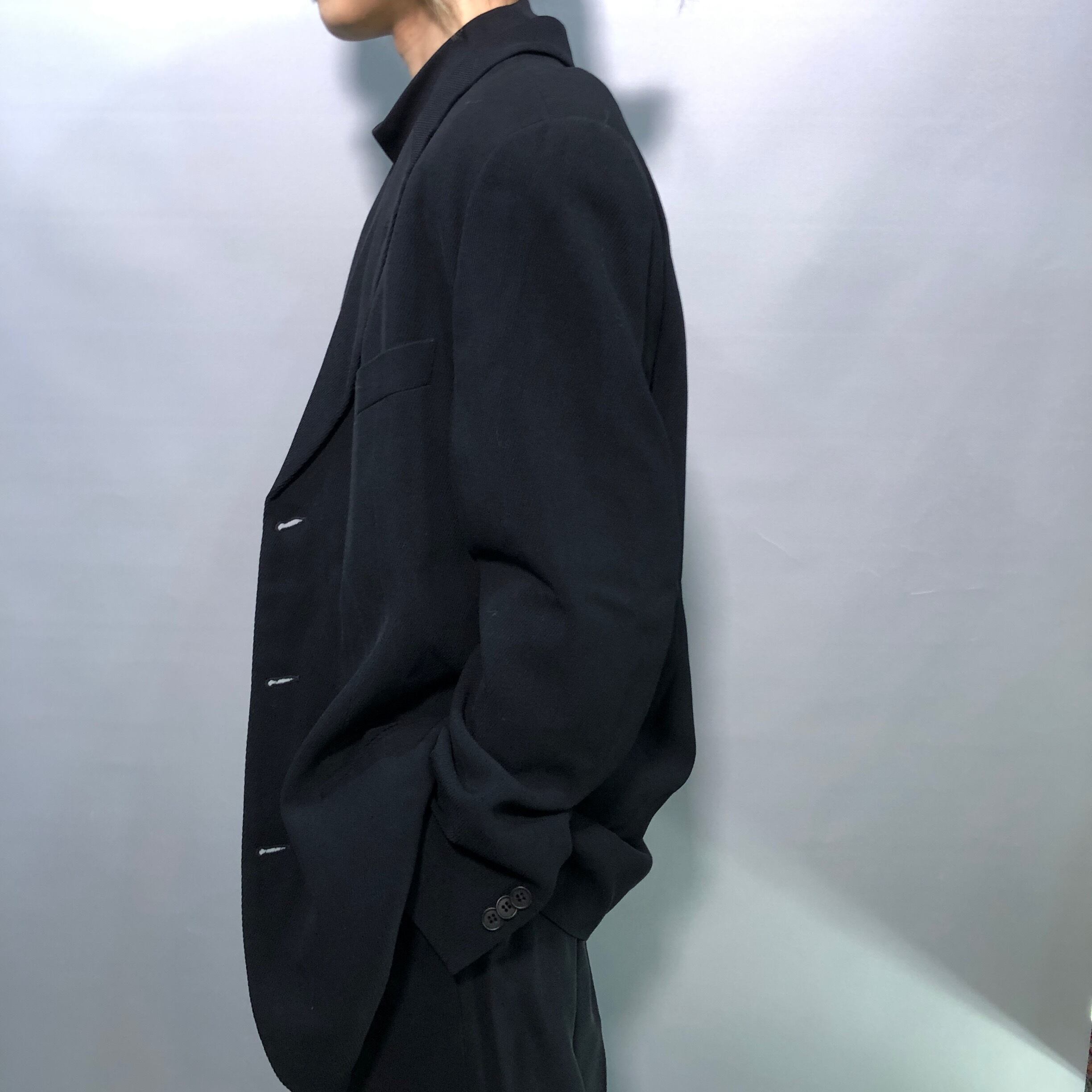 しっかりとした素材感に、シンプルながら美しいシルエット、深いブラックが着るもののセンスを引き立てます、オンオフ問わず活躍頂ける一着。