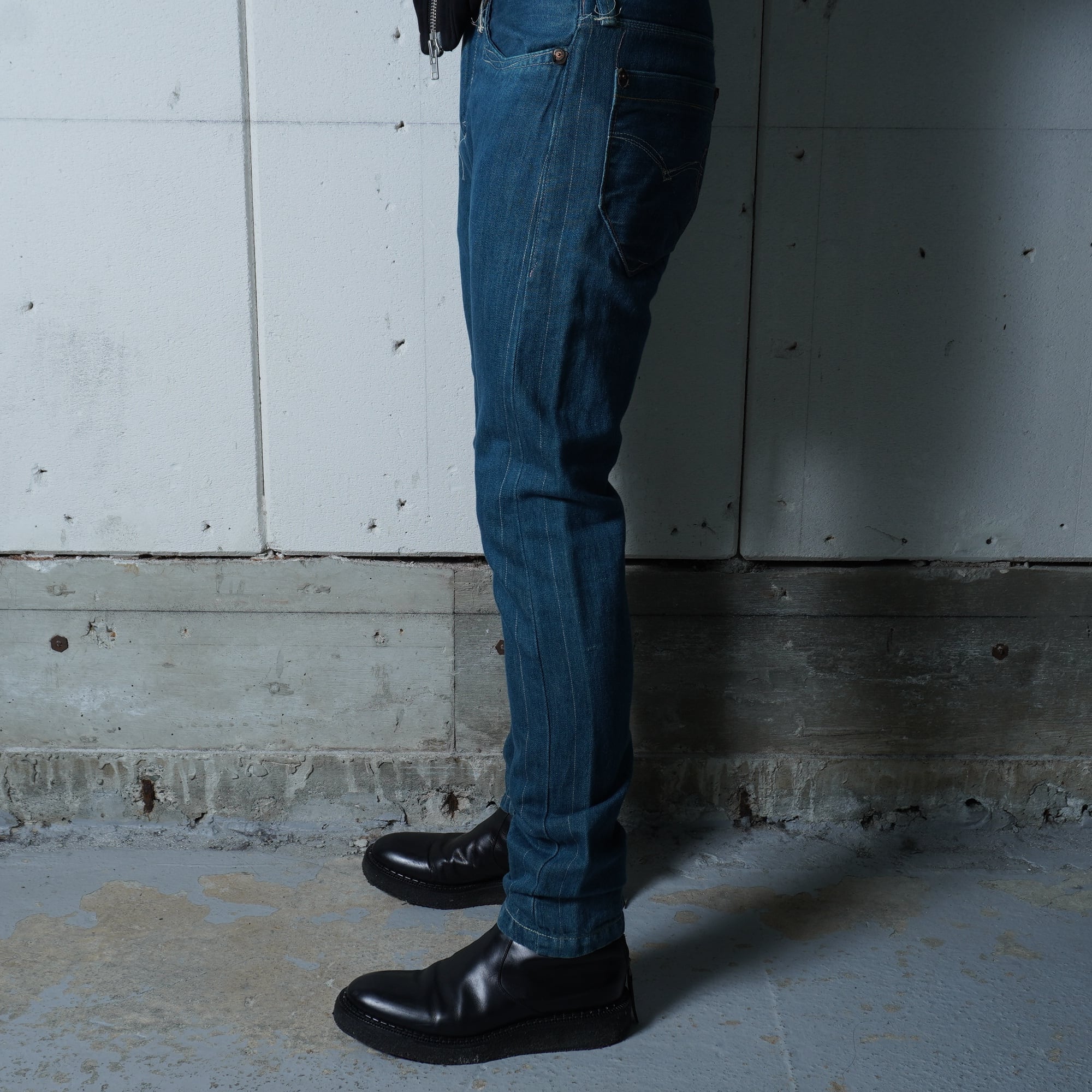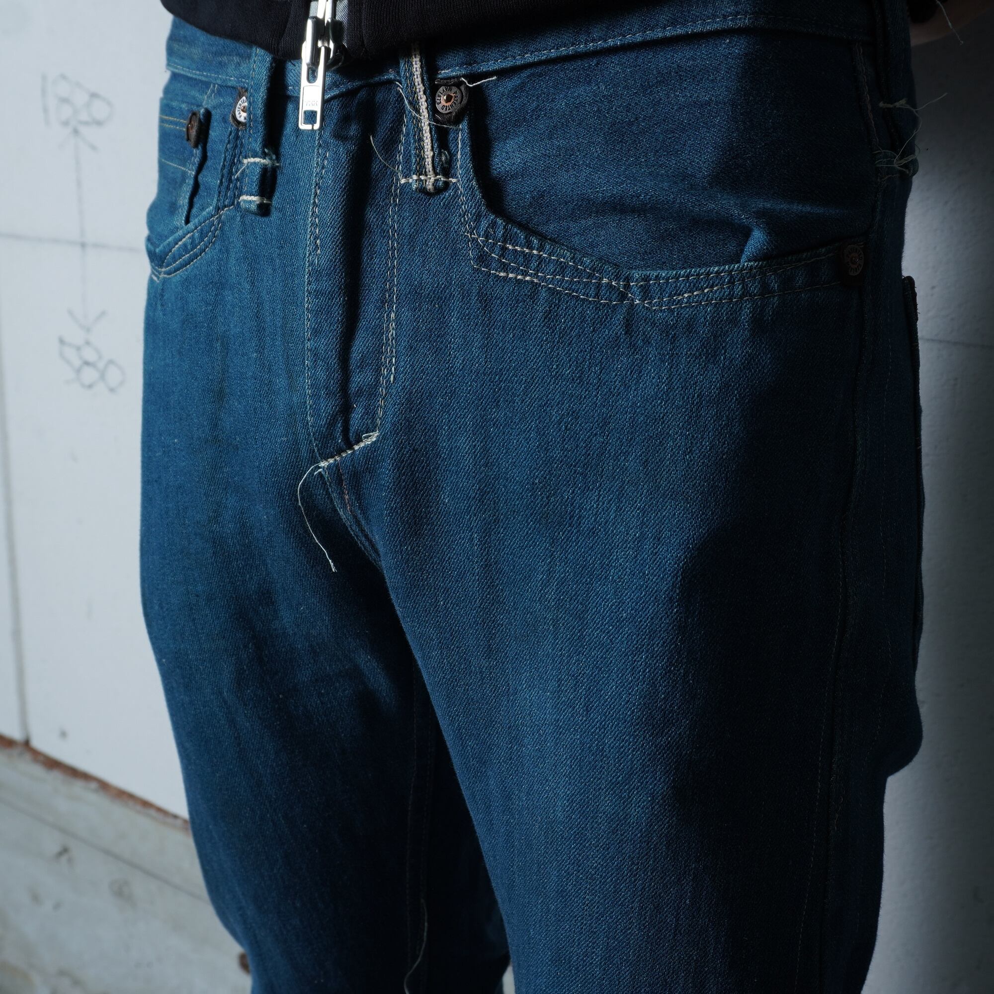 あえて切りっぱなしにされて飛び出た糸やステッチ、切り替えデザインなど現行品にはないディテールがたまらないデニムパンツです。
