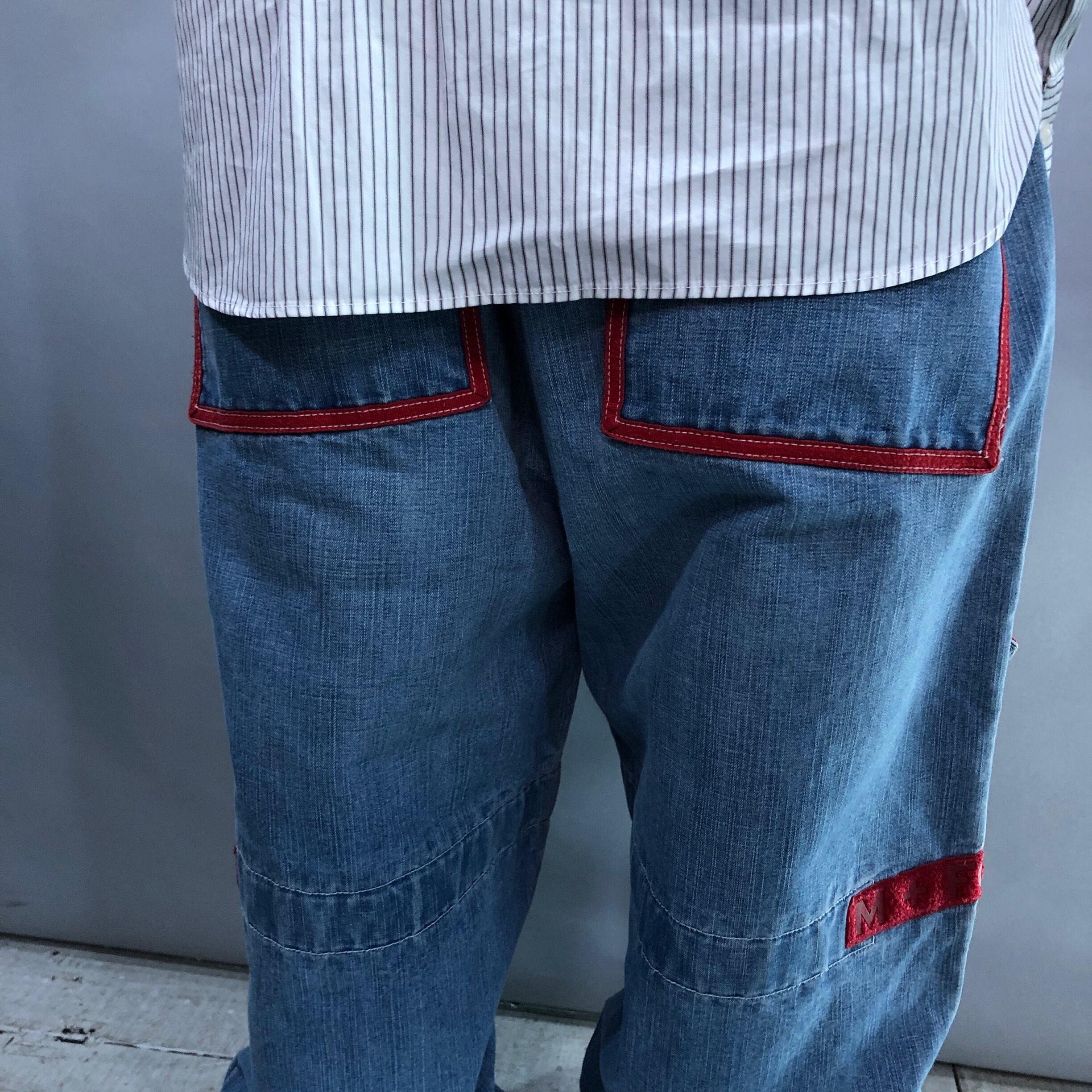 著名人も多数着用されている、ブルーボディに赤のストラップが絶妙に映えるデザイン、膝と裾のストラップでサイズ調整可能でバギーサイジングながら引きずらずに着用いただけます。