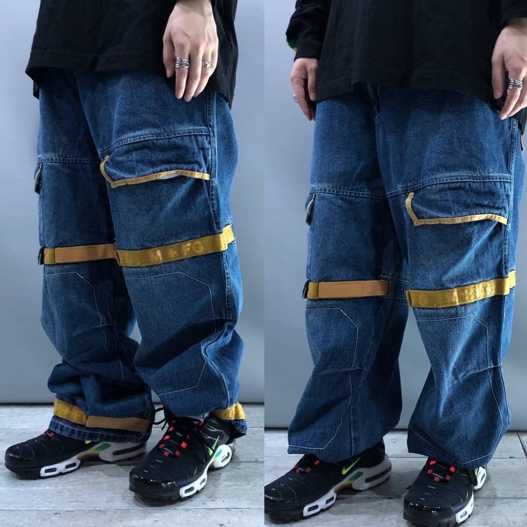本田翼も着用されている、ブルーボディに黄色のストラップが絶妙に映えるデザイン、膝と裾のストラップでサイズ調整可能でバギーサイジングながら引きずらずに着用いただけます。