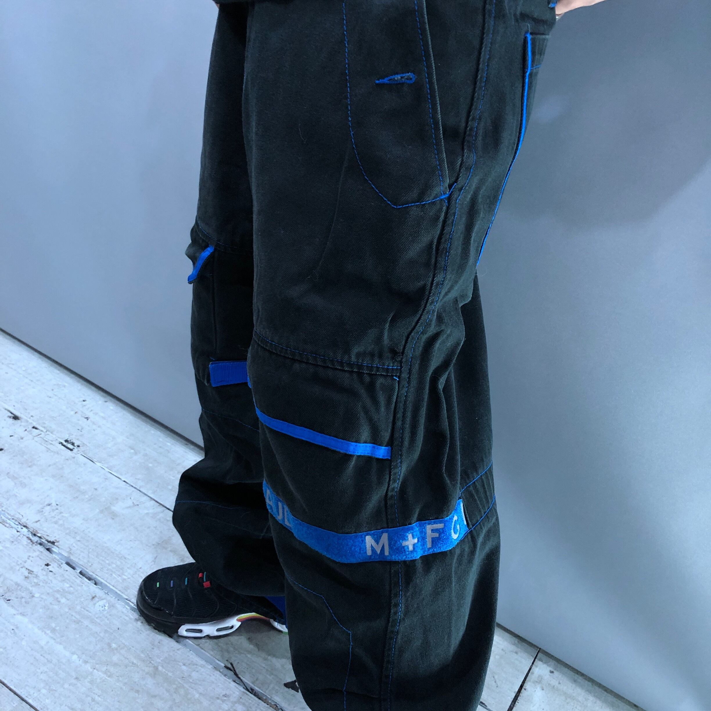 本田翼さんも着用されているシャトルデニム。ブラックベースにピュアブルーのベルクロが絶妙に映えるデザイン。サイズ調整可能でバギーサイジングながら引きずらずにご着用いただけます。