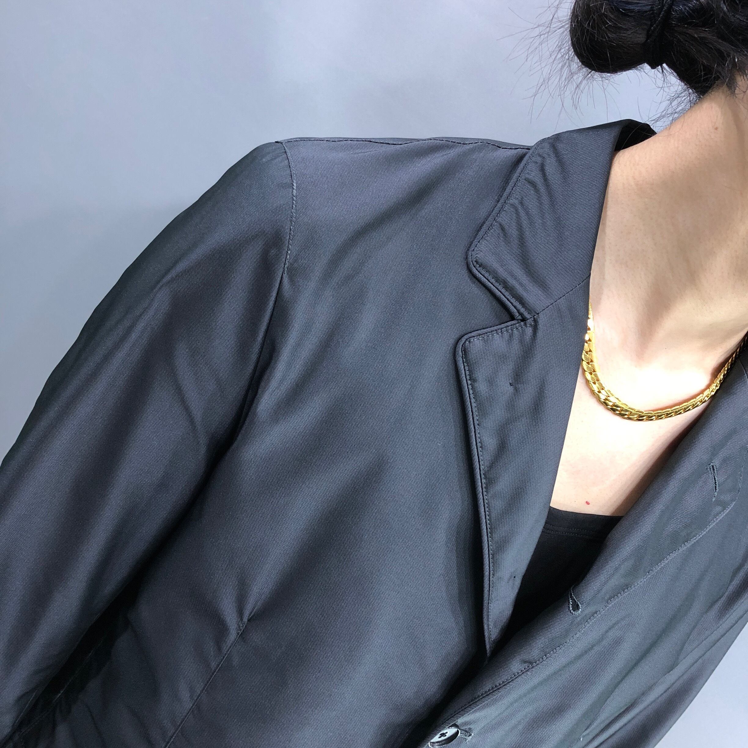 すっきりとしたシルエットでしっかり決まる、ナイロン素材ならではの光沢感で様々なカラーのインナーと合わせても面白い1着。