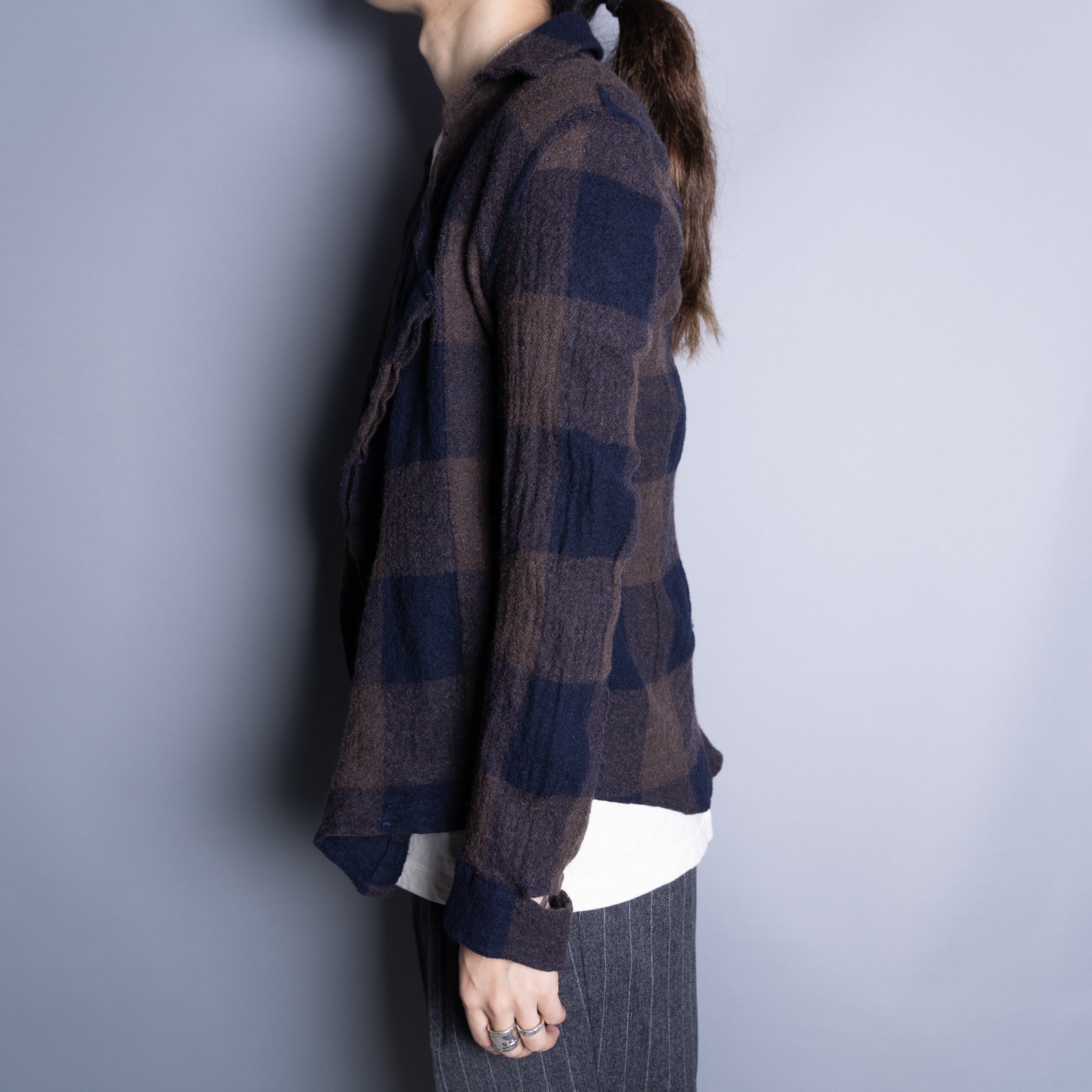 パンキッシュなデザインが目を惹くウールシャツ。シャツジャケットのような雰囲気でアウター、インナーどちらにもお使い頂けます。めっちゃタイトなので体型に自信ある方に是非。