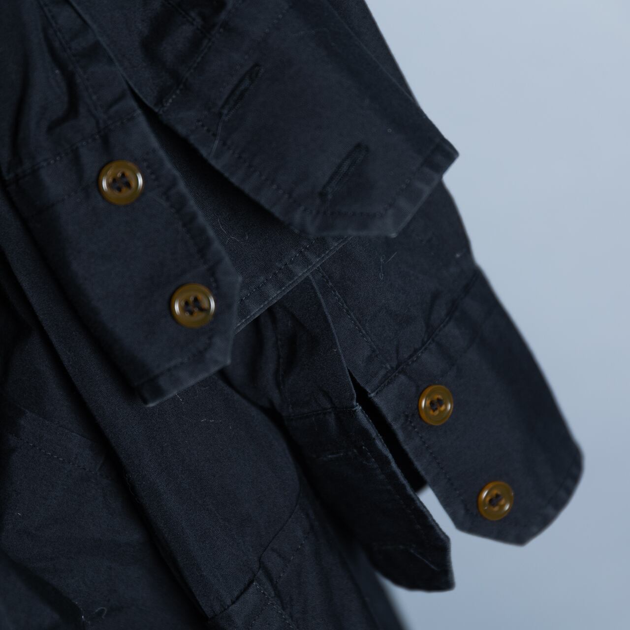計算され尽くされたシルエットのブラックシャツ。胸元のオーブ刺繍がワンポイント。スキニーにマーチンを合わせてロックに決めて欲しい1着。