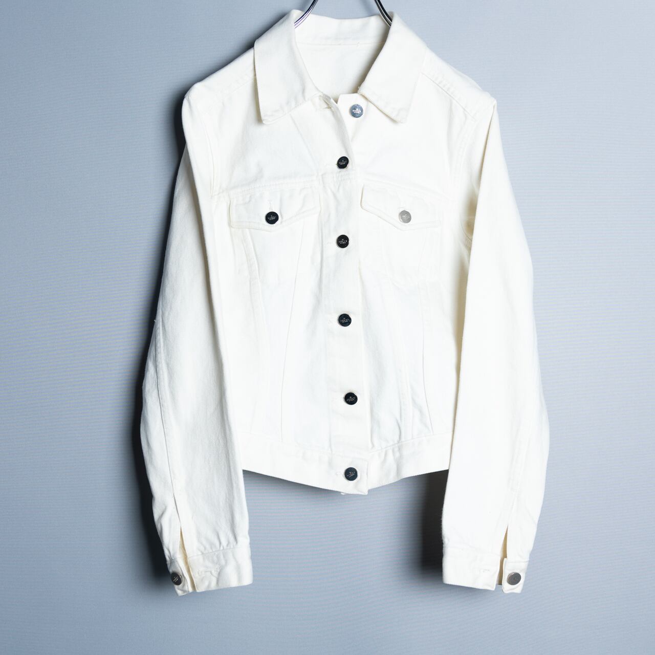ホワイトが映える軽い羽織心地のデニムジャケット。メタルボタンにも全てロゴ刻印あり、細部までこだわられた逸品。