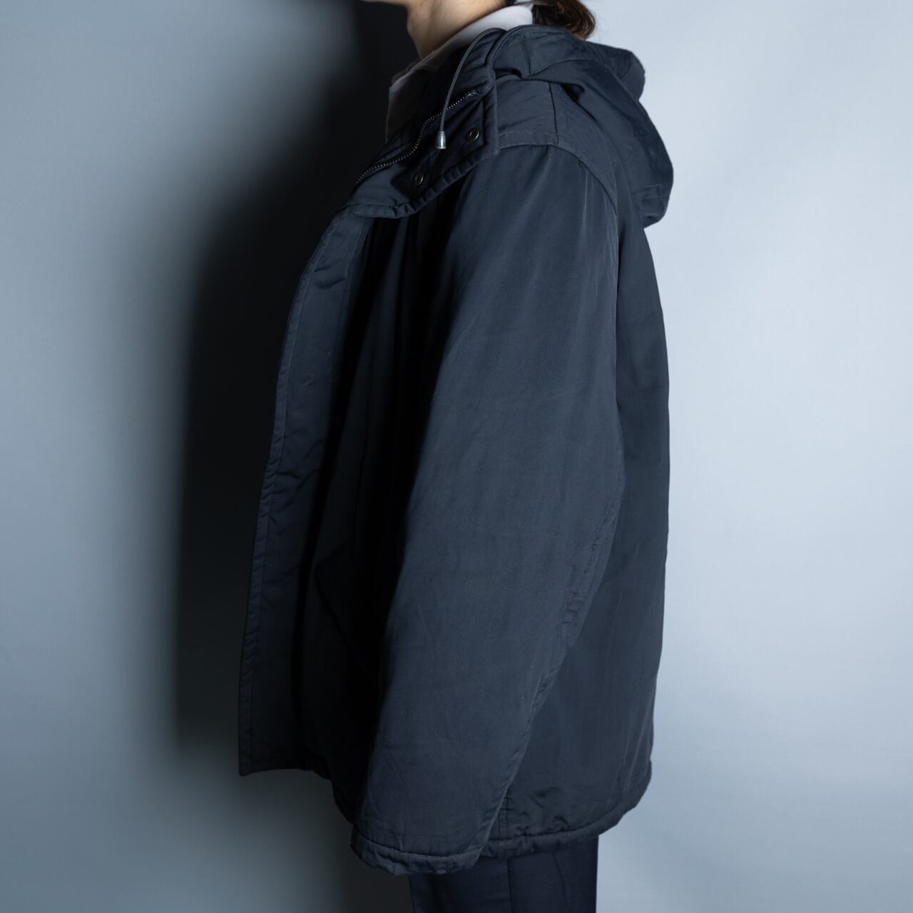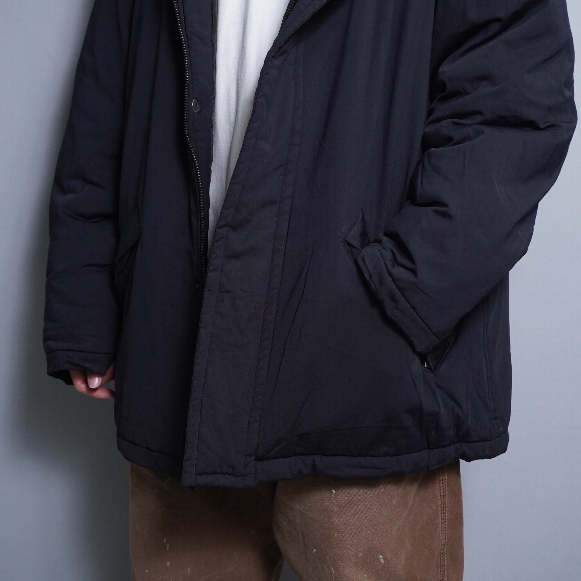 オーバーサイジングなフーデッドコート。しっかり重めで中綿が詰まっているので防寒性も抜群。シルエットも良くヘビーユースにもってこい。