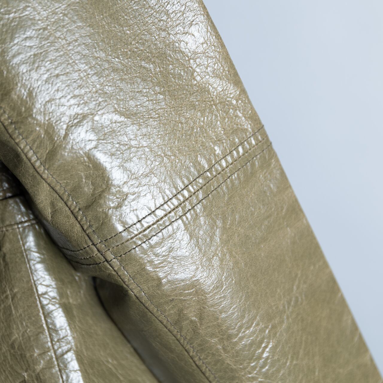 レザーのような質感のコーティングコットンジャケット。硬めのマテリアルながらめっちゃ軽く着心地よし、そしてまさかの手洗い可能なのも嬉しいポイント。