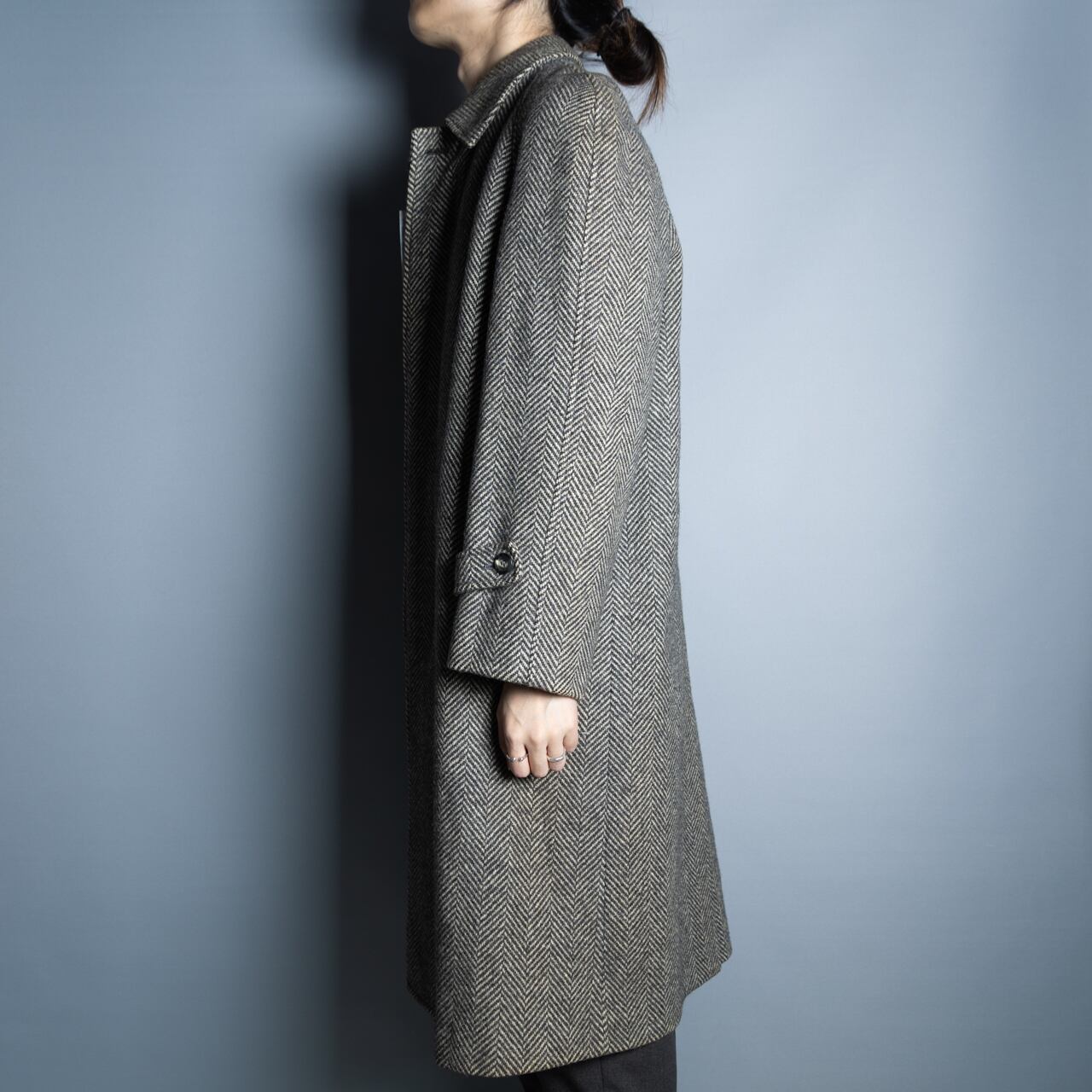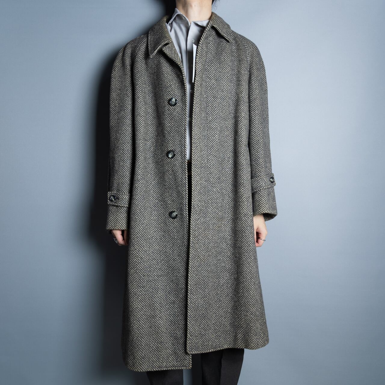 一定間隔で綾目を右上がりと左上がりを繰り返す、綾織りの変化組織の代表的な生地、杉綾、別名ヘリンボーンはにしんの骨の意味、シンプルになりがちな冬のスタイリングを羽織るだけで一気に華やかになる1着です。