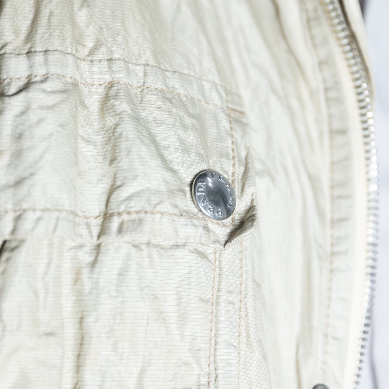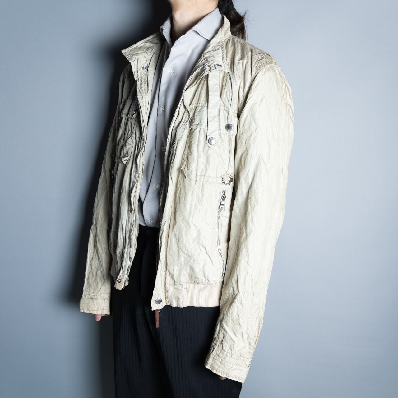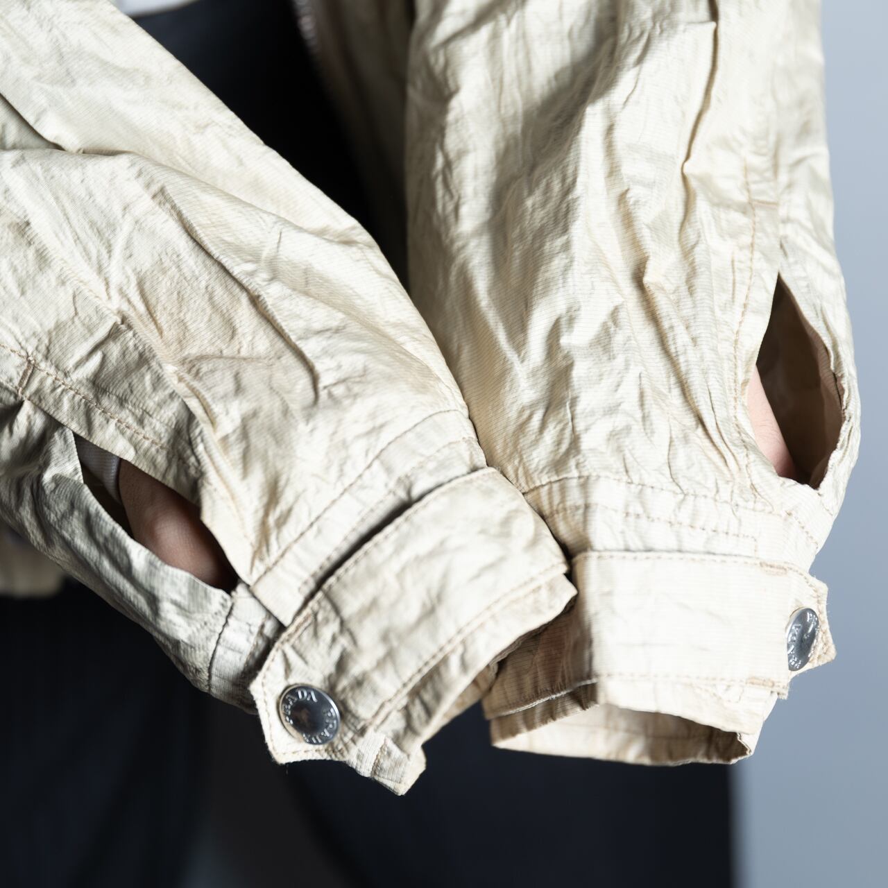 ナイロン素材に金属素材を使用したシワ加工が、さりげないこなれ感を演出する1着、ディティールにもこだわりが見られデザイン製の高さを感じられるアイテムとなっております。