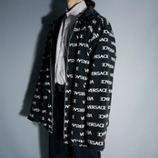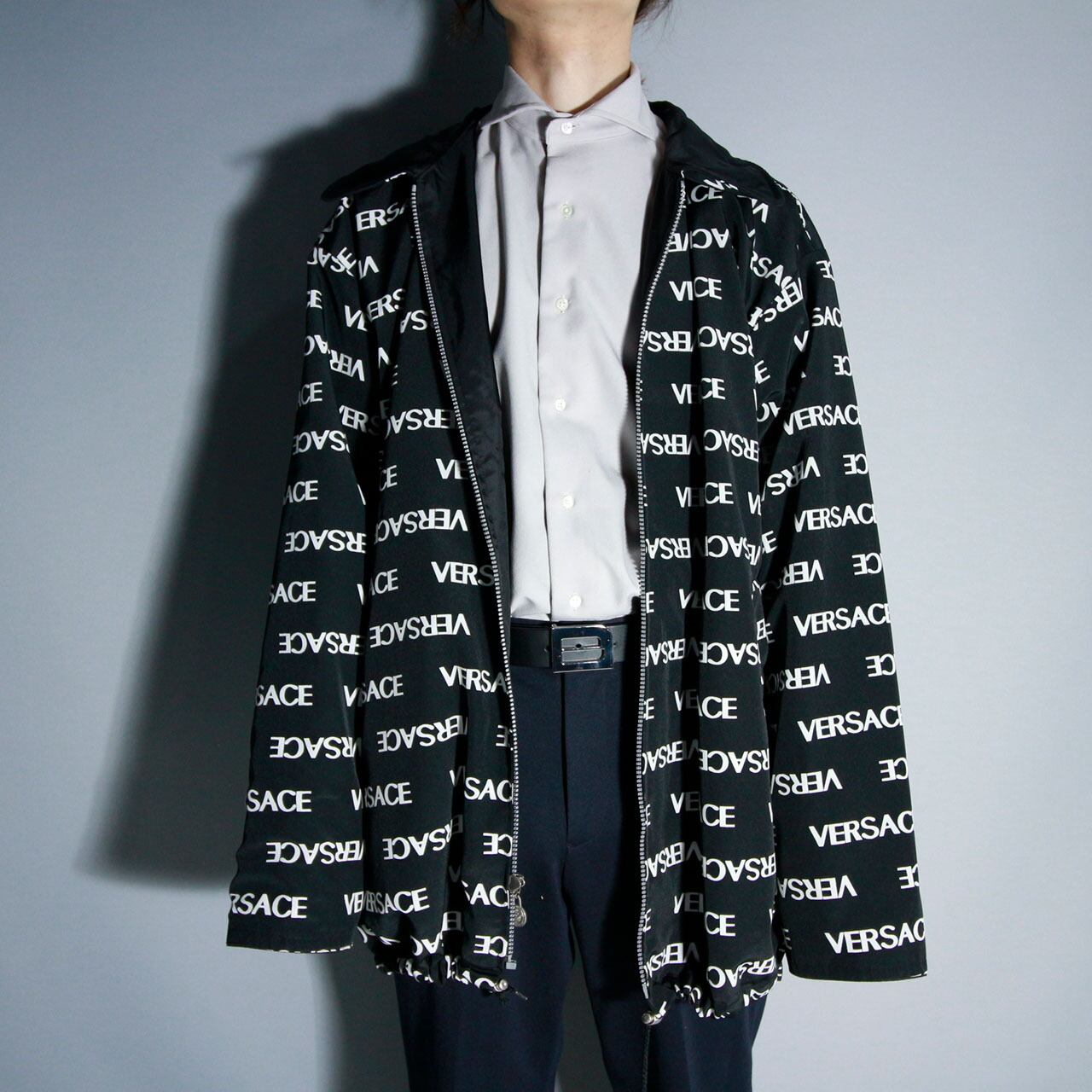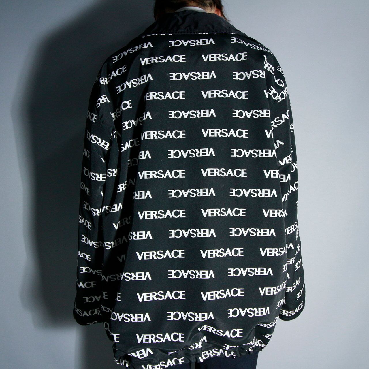 バックのメデューサロゴ、リバーシブルで裏側はブランドネーム総柄の存在感が際立つブラックカラールーズシルエットナイロンジャケット。2パターンの着こなしが楽しめる良デザイン。