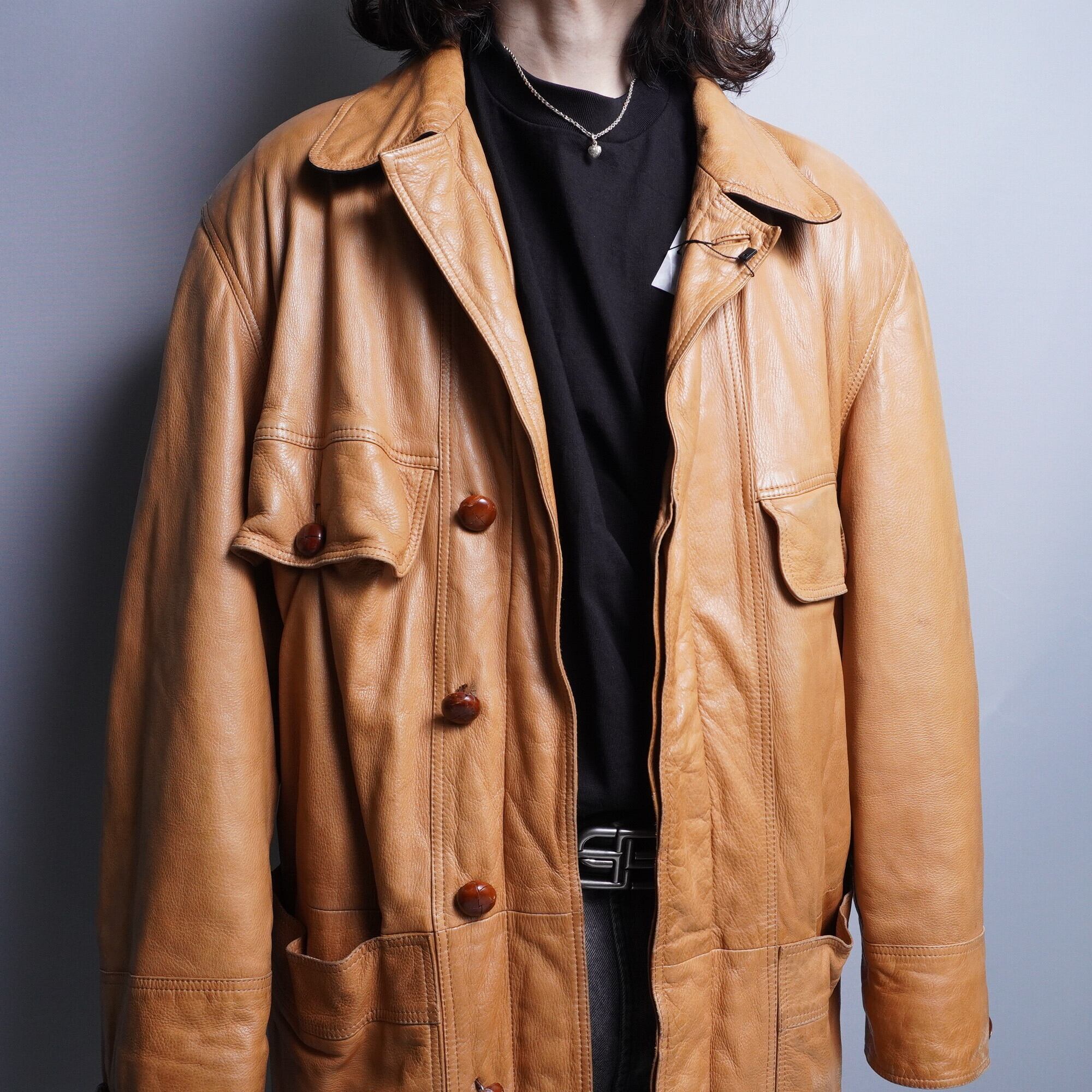 エレガントで上質なレザーでつくられたくるみボタン仕様のレザージャケット、艶感溢れるオーバーサイズ仕様で着用頂けます。