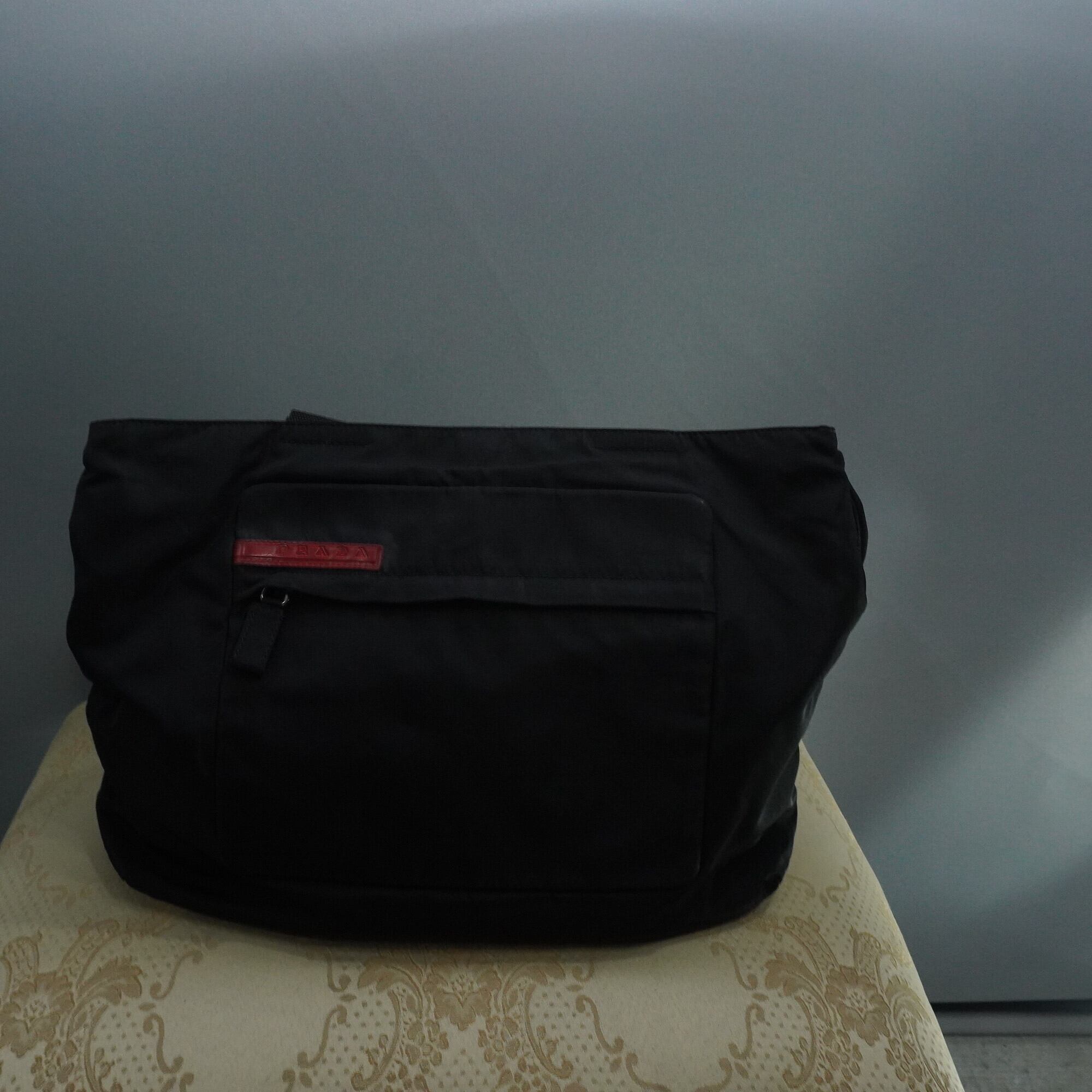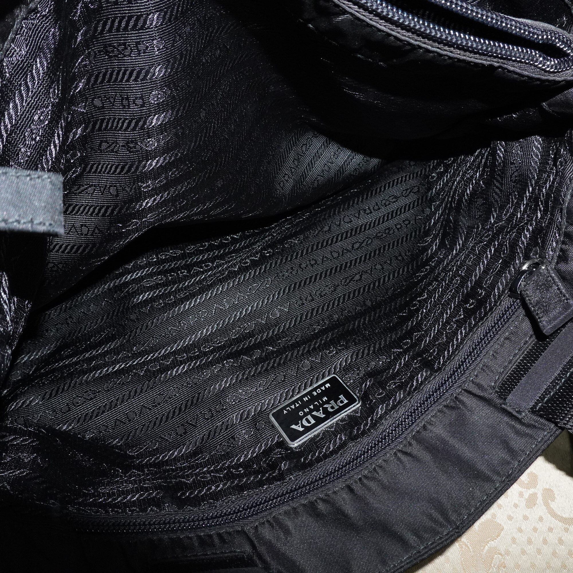 プラダが得意とするナイロンバッグ。多収納型で多くの仕切りやポケットがあります。表面はシンプルなデザイン、中は黒字に黒でPRADAのロゴの羅列という遊び心満載のバッグ。