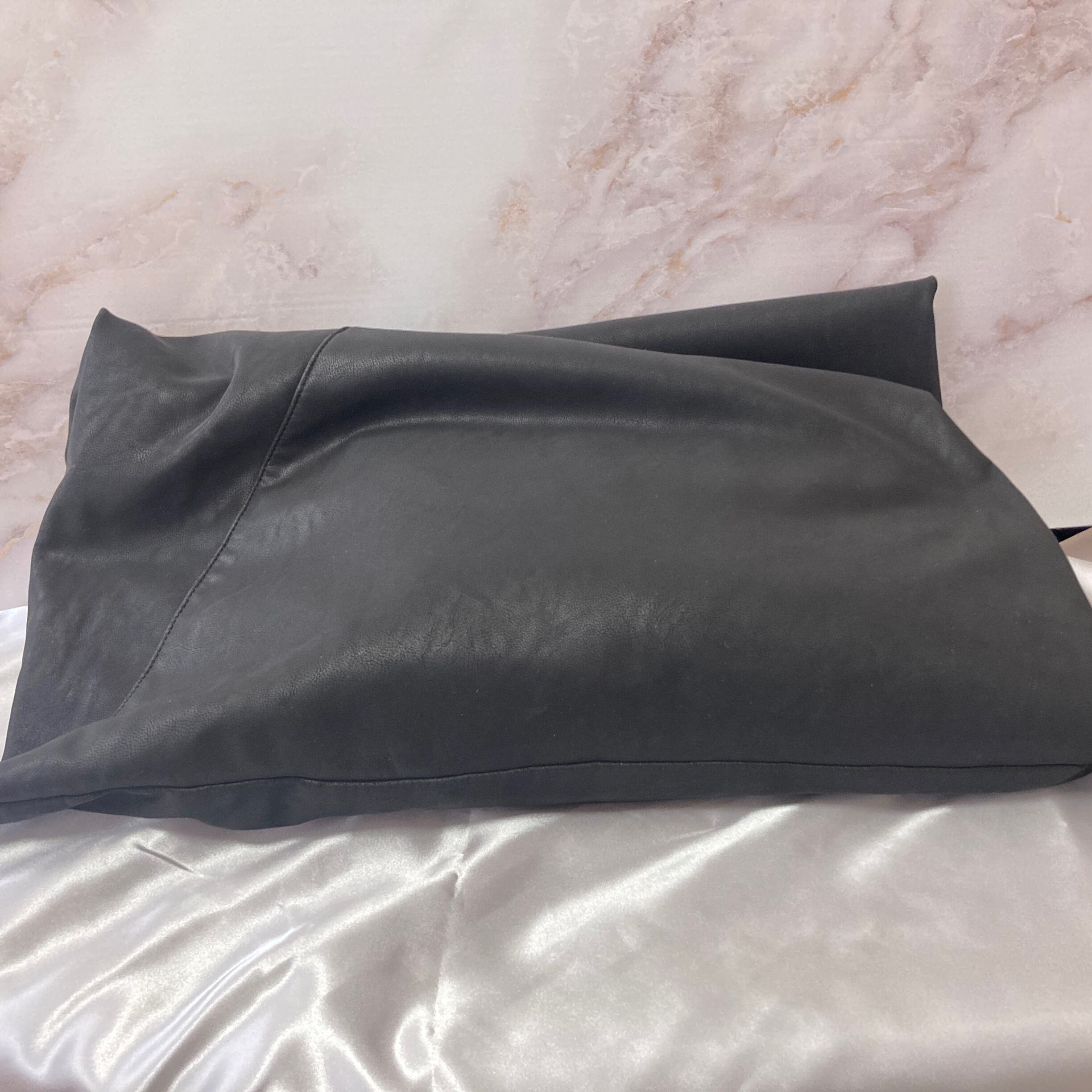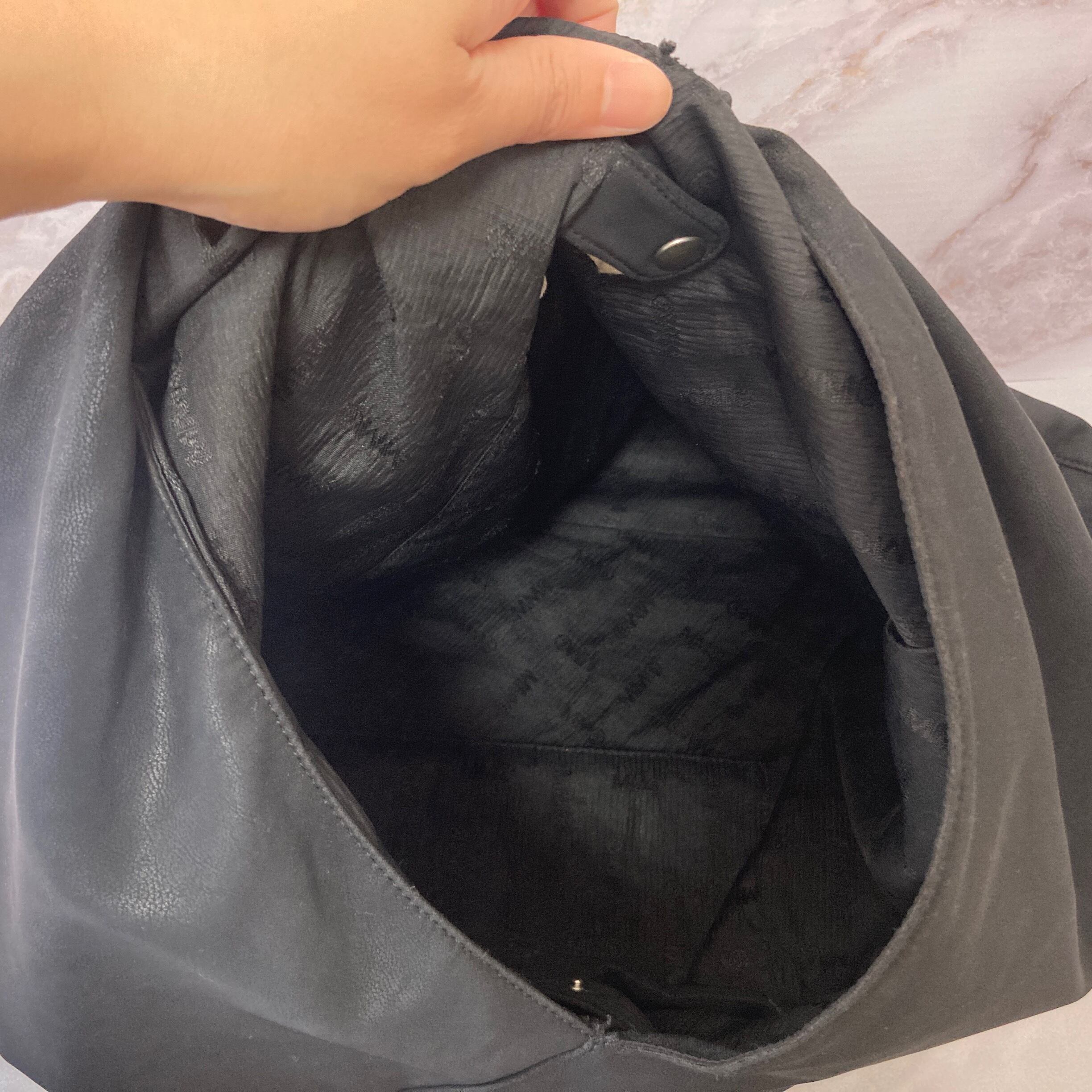 ハンドル部分にはブランドロゴの型押しがあり、柔らかい素材で収納力も抜群です。
