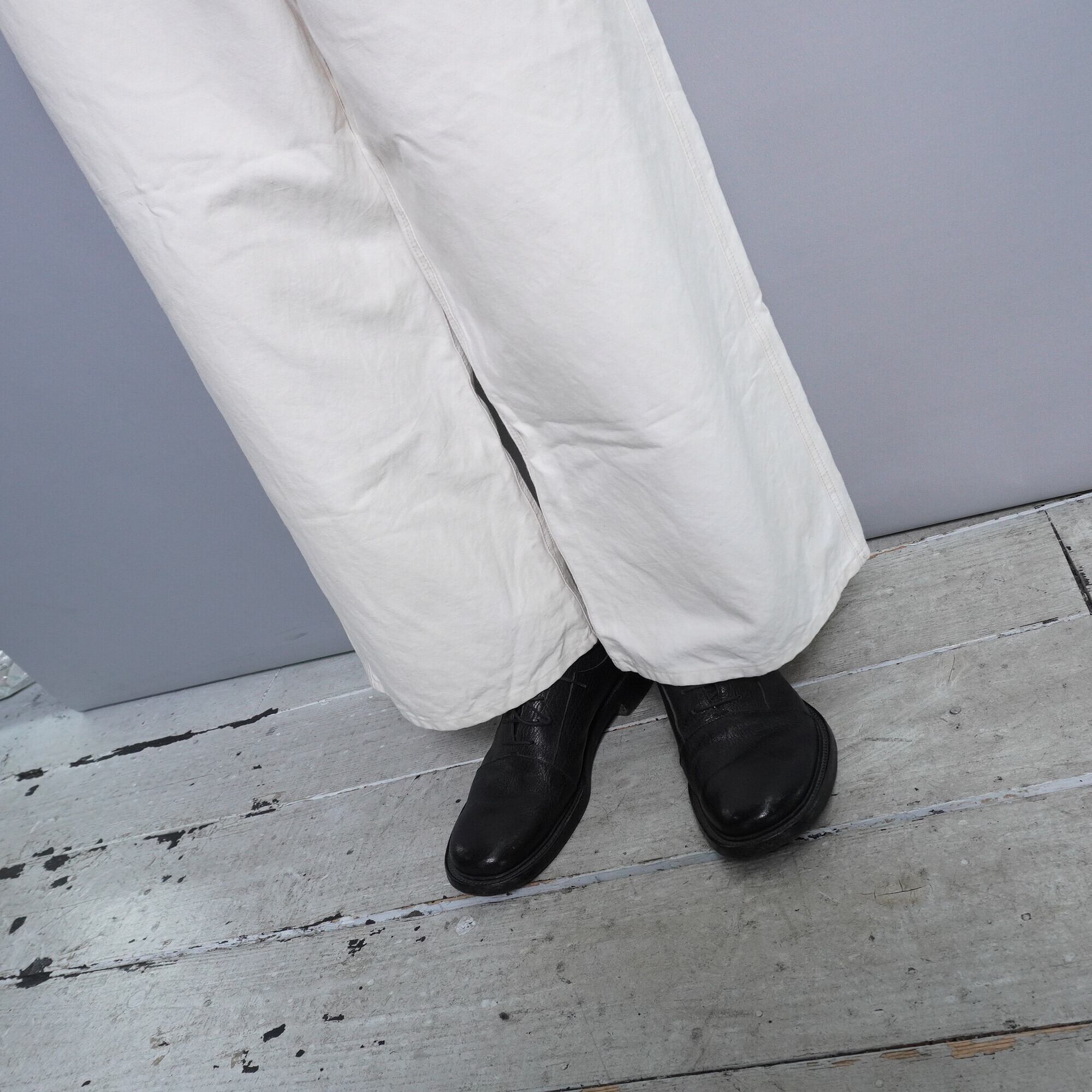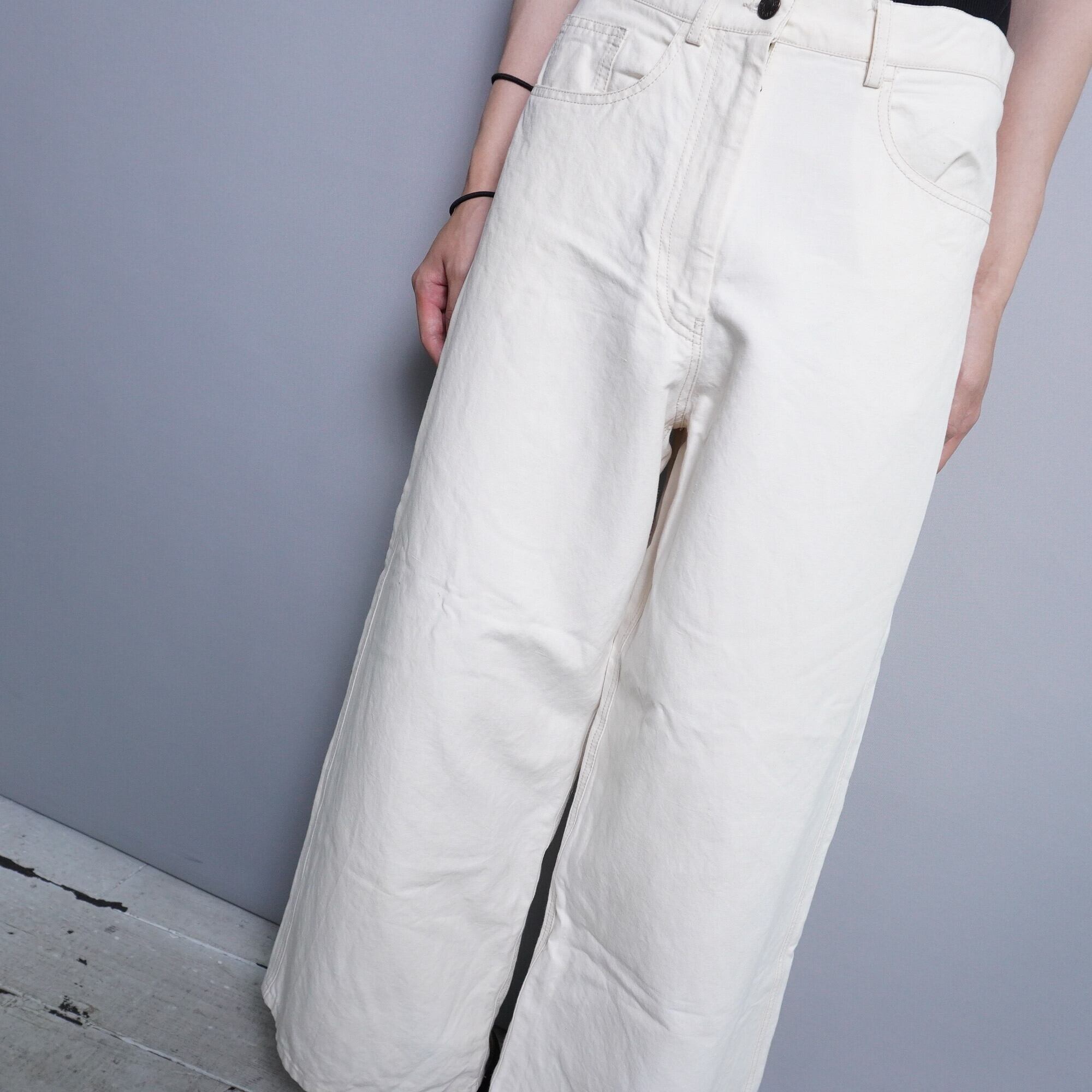 コットンとリネンの混合素材を使用したデニムパンツ。リネンが使われているため、少しカラッとした素材感で夏にも気軽に使用できる。極太シルエットとホワイトデニムというトレンドをバッチリ抑えた一着。