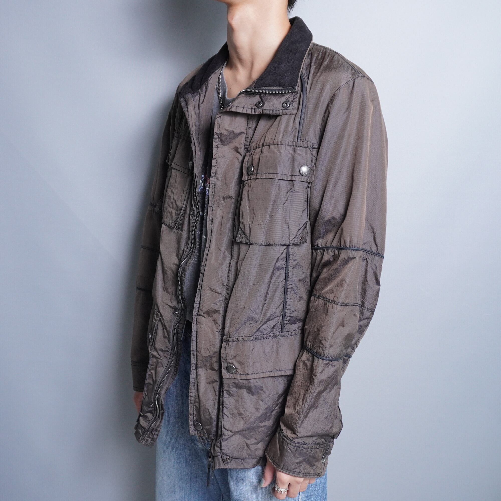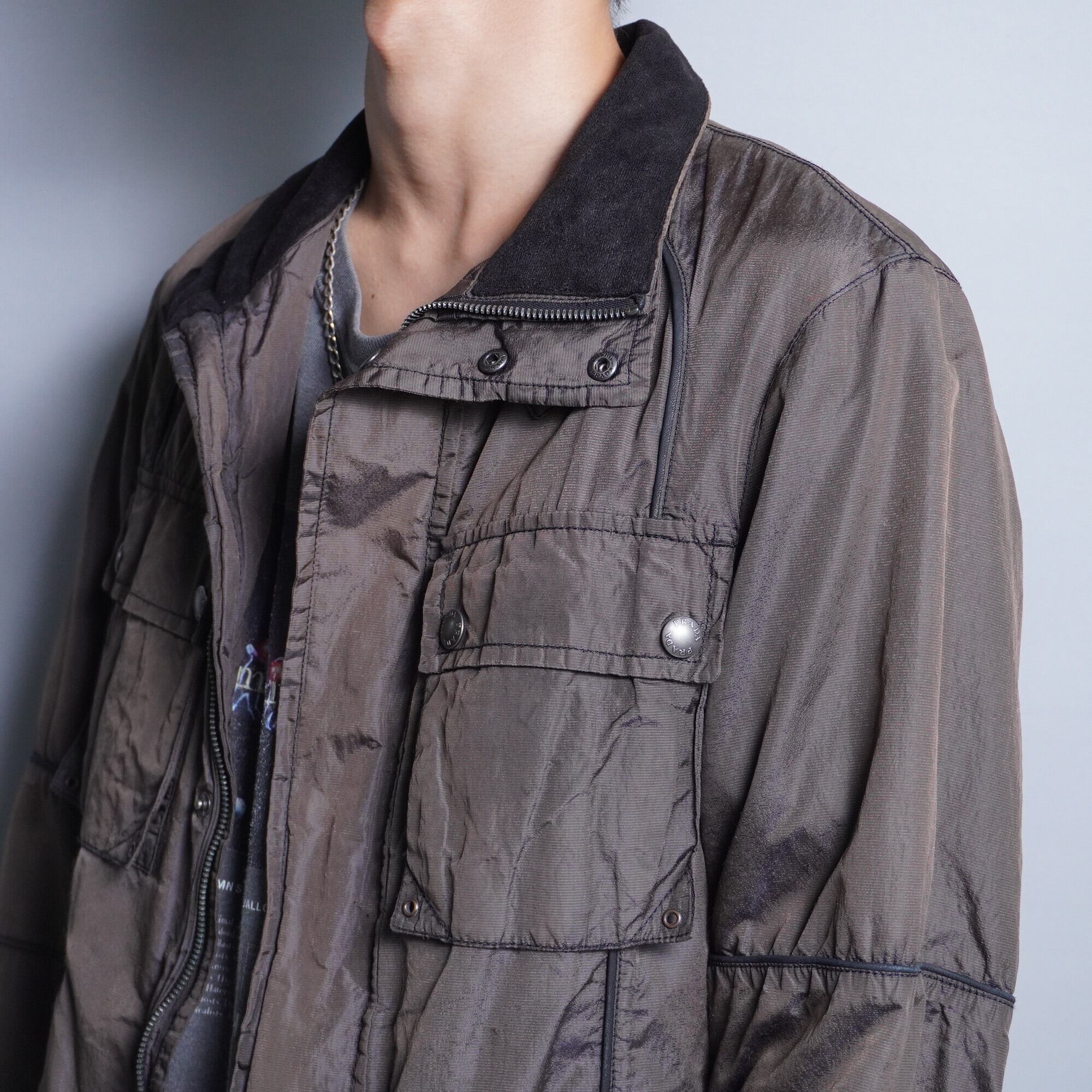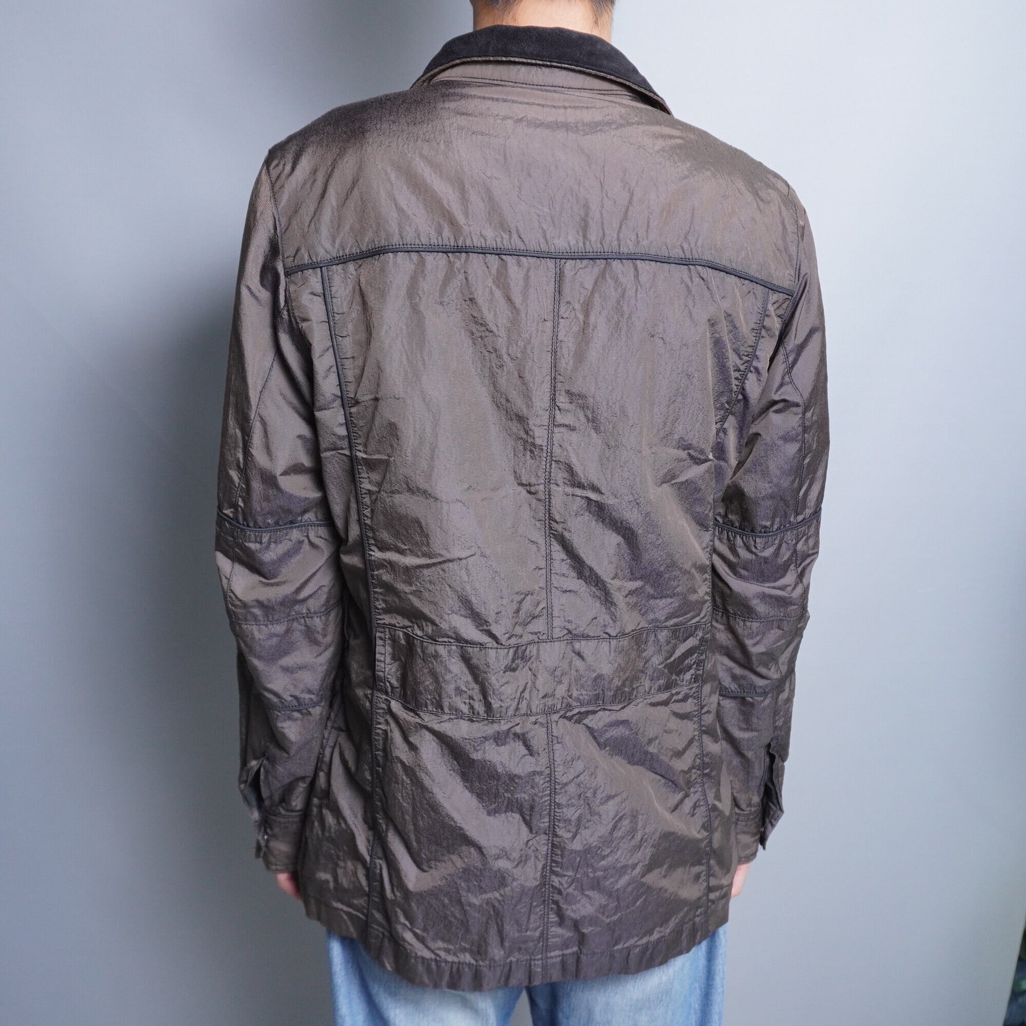 ナイロンにメタルが配合された混合素材で、メタル特有の光沢感と手触りが特徴的。至る所にボタンやポケット、切り替えしなどのギミックがあるため、存在感抜群の一品。