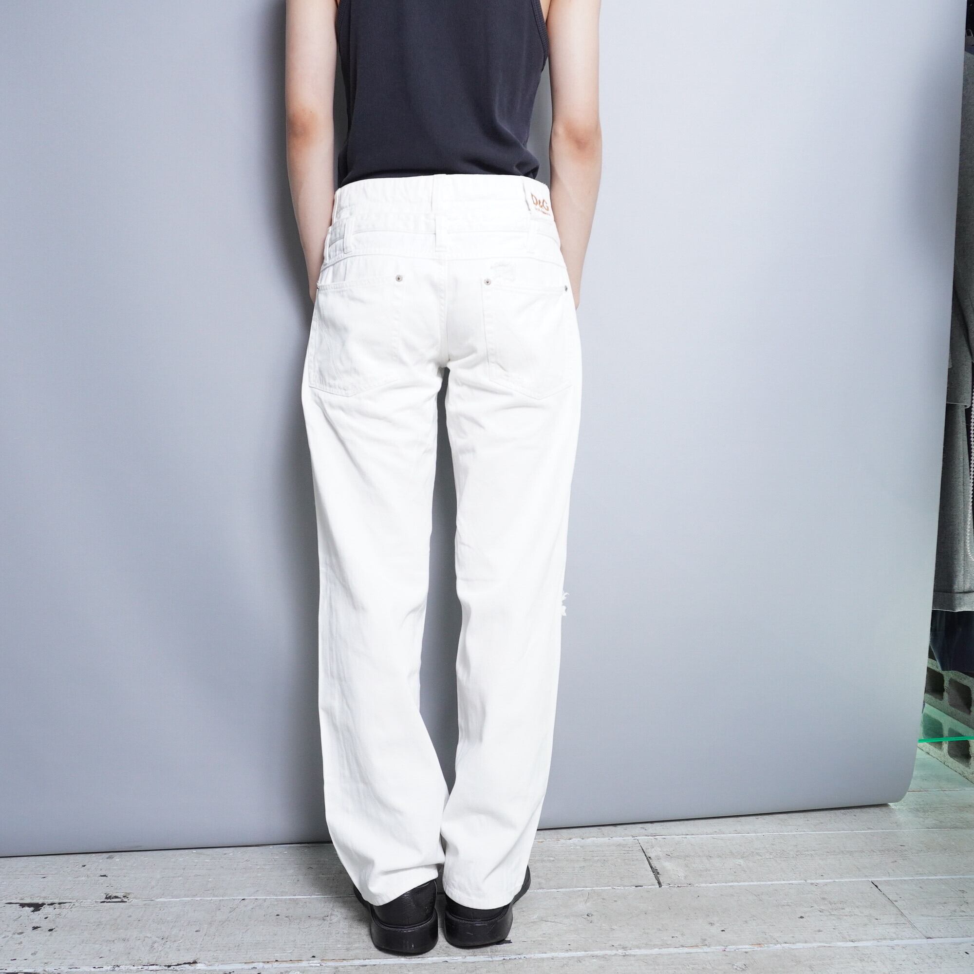 ダブルウエスト仕様のデニム地ホワイトパンツ。