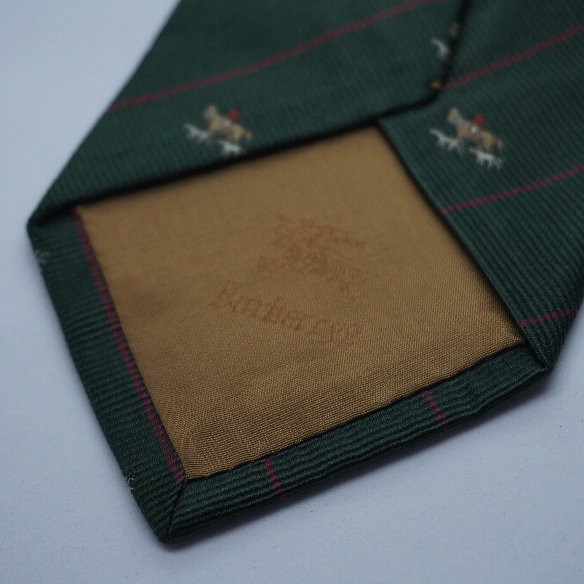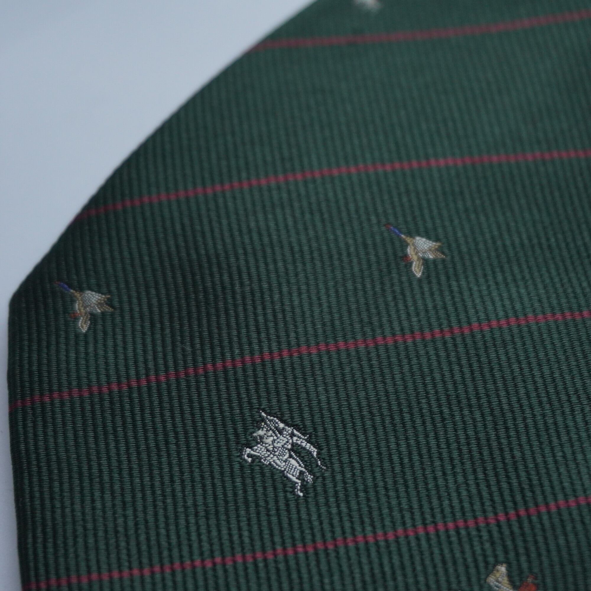 Burberryのアイコンがさり気なく刺繍されているデザイン、グリーンに細いストライプは着用シーンを選ばない万能タイ