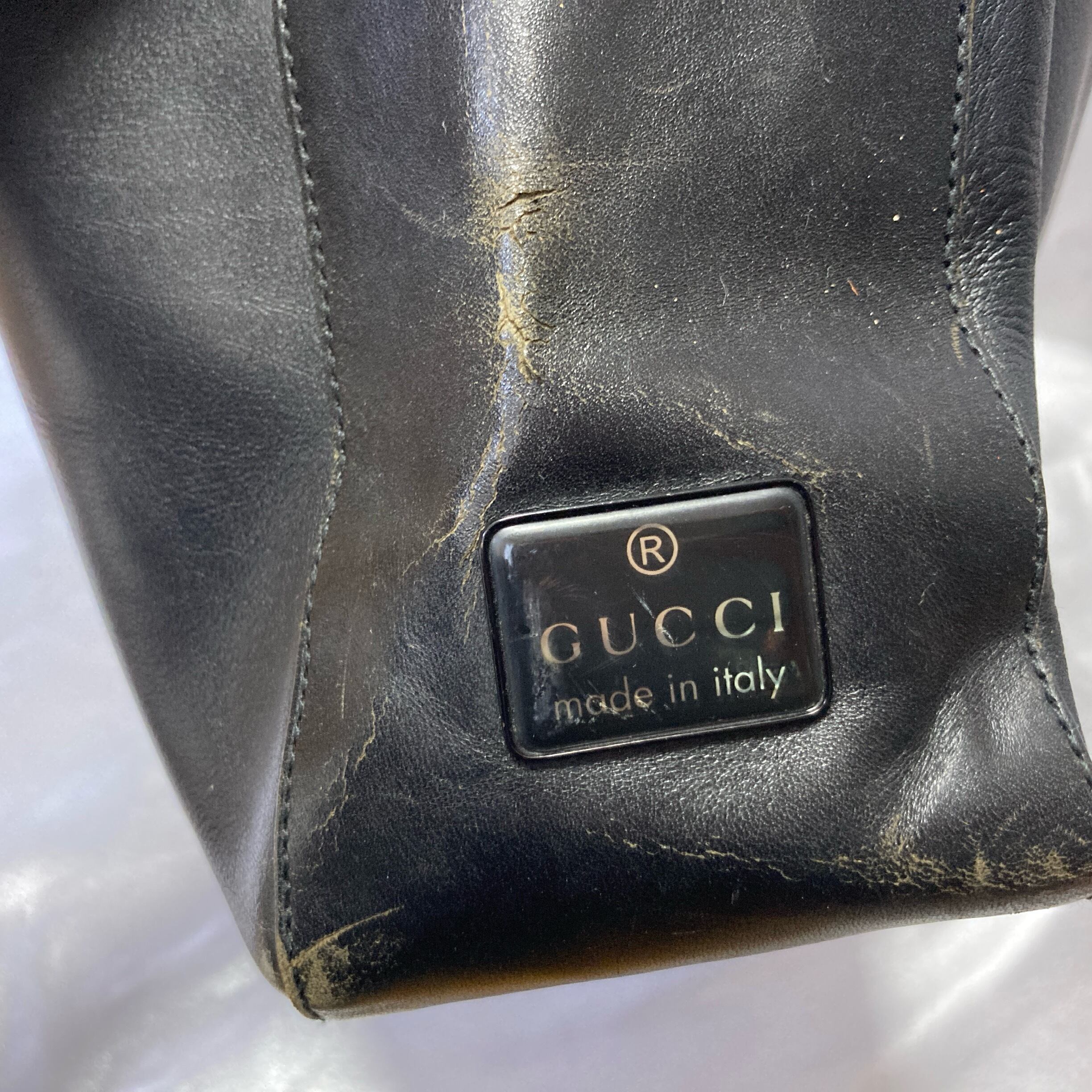 【GUCCI】GUCCI ロゴプレート×ブラックレザー ショルダーバッグ
