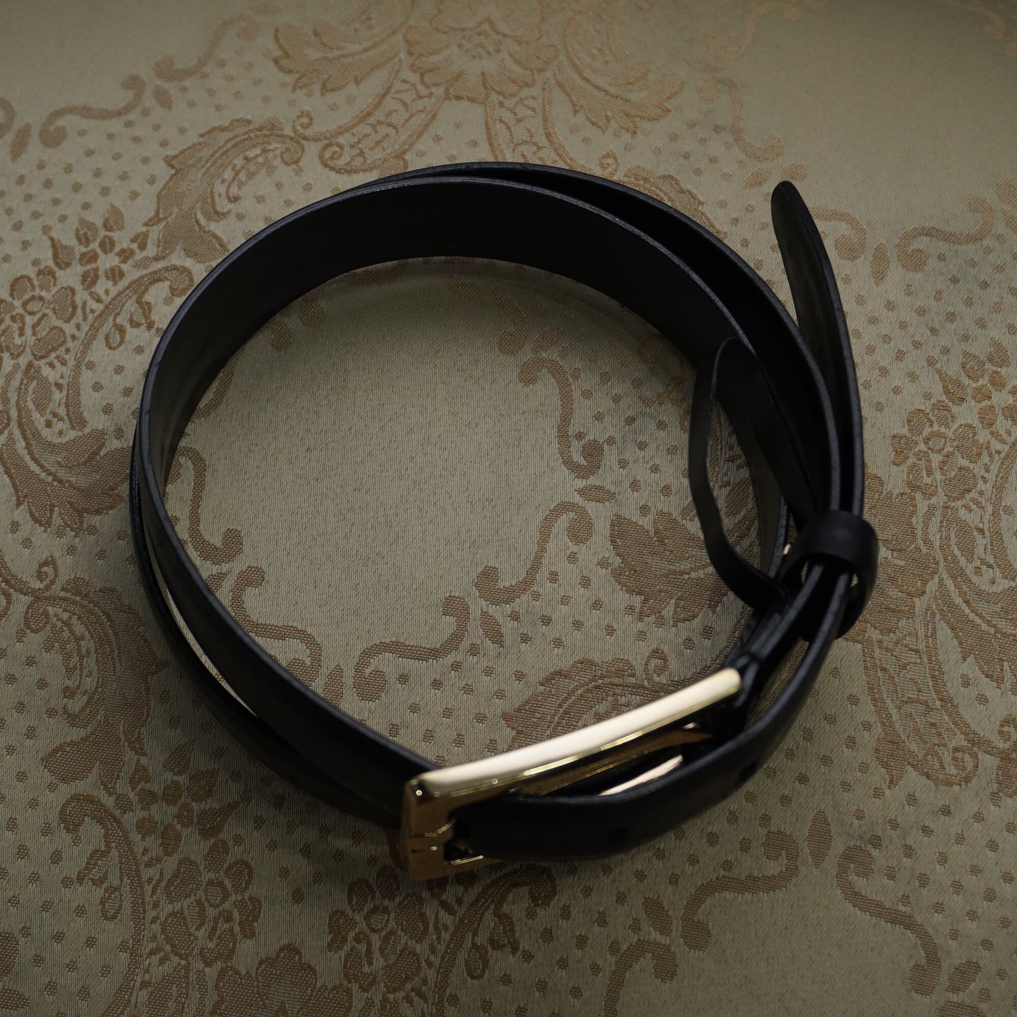 存在感抜群のゴールドバックルがアクセントにちょうど良い、細めのベルトも腰回りをクールに彩る逸品です。