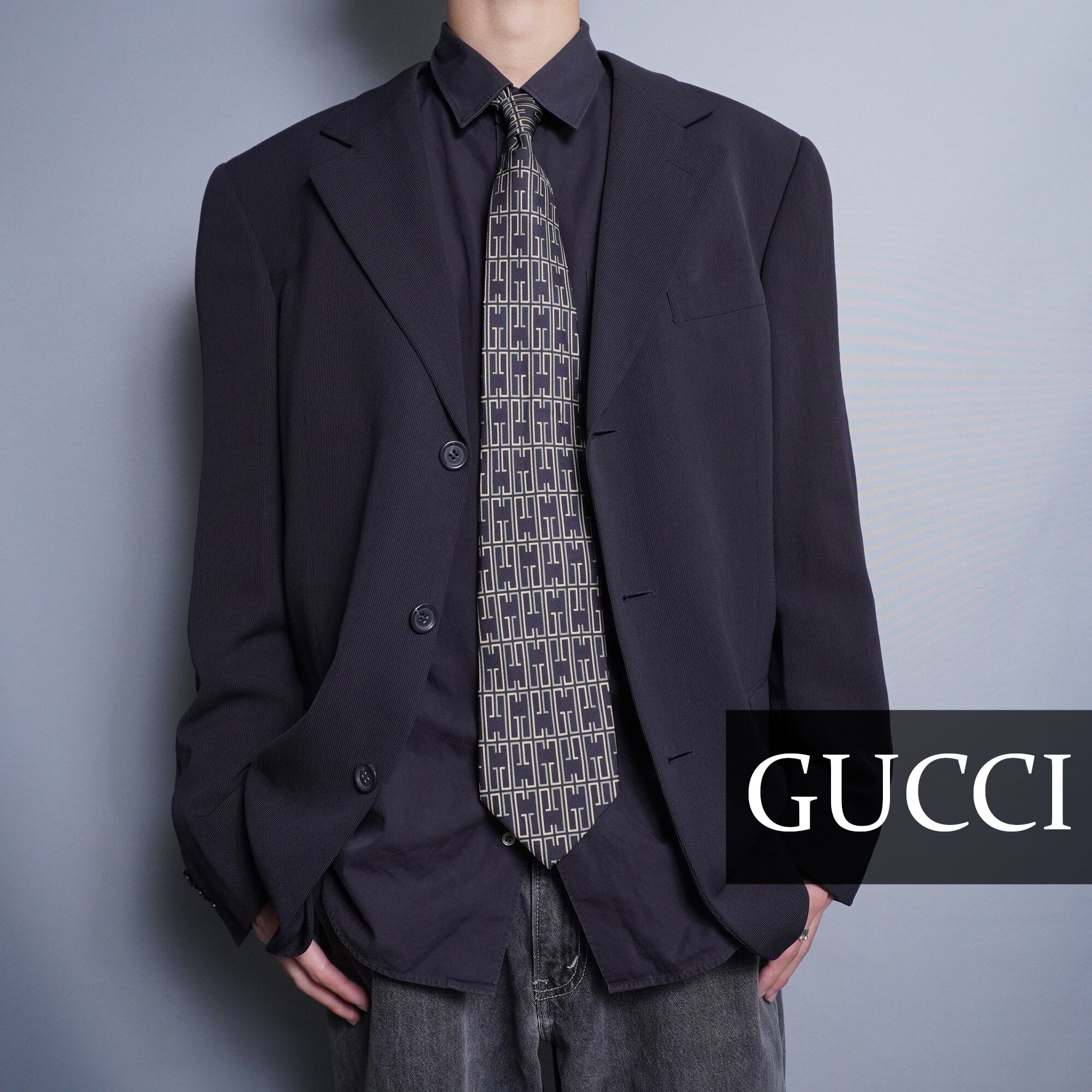 GUCCI定番のGC総柄ネクタイになります。遠くから見るときと、近くから見るときの見え方が違う絶妙な配色とバランス感が特徴。