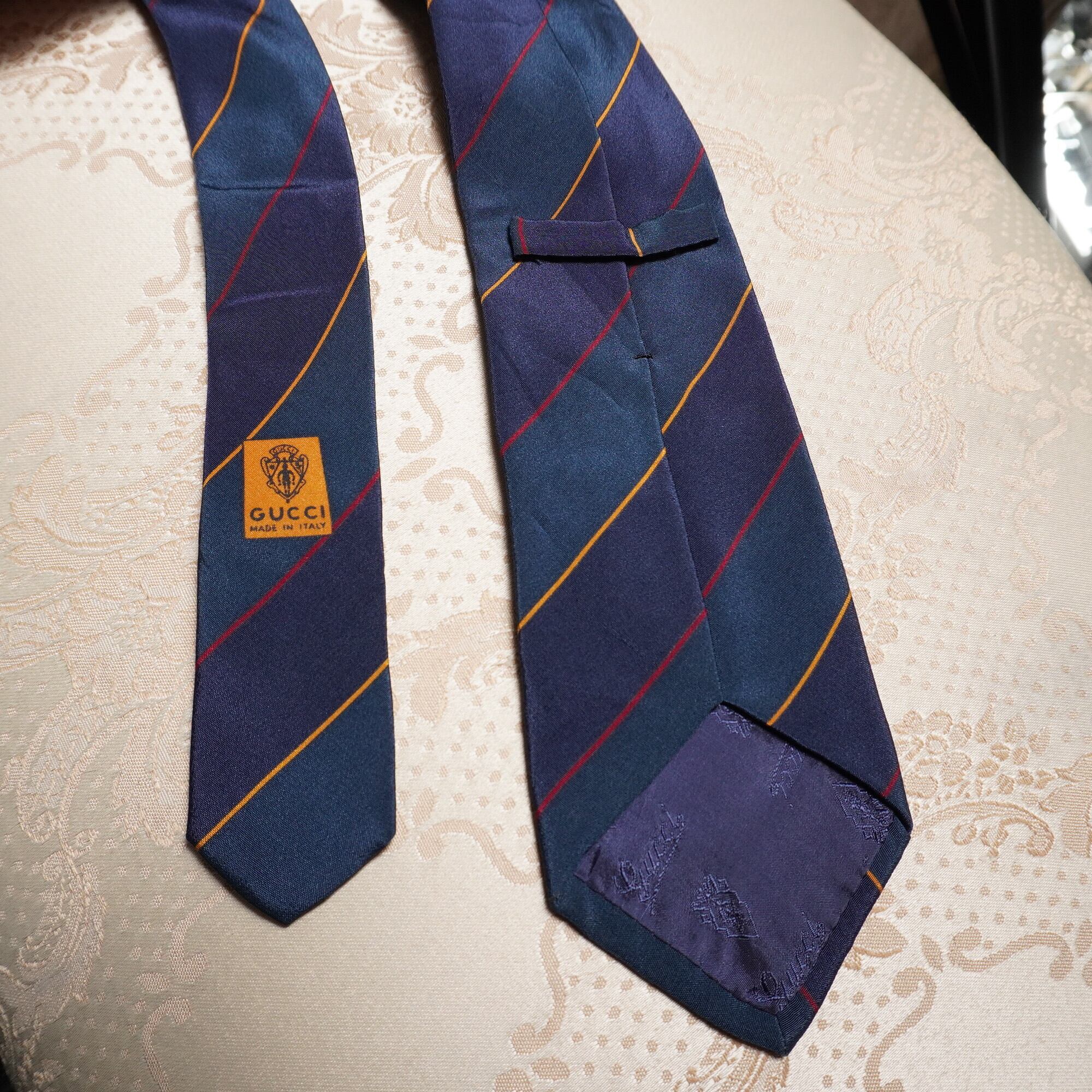 【GUCCI】グッチ GCロゴ リボンカラー レジメンタルストライプ柄 ネクタイ Navy × Green