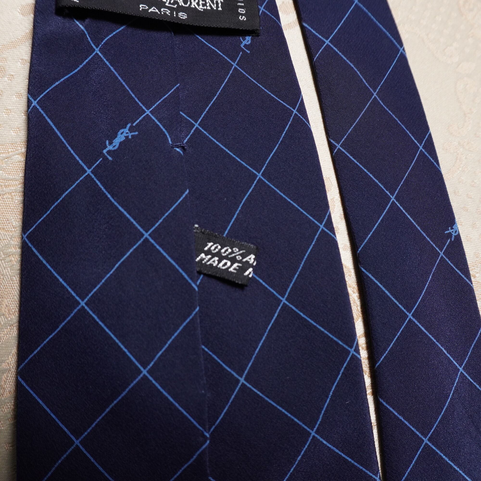 【Yves Saint Laurent】イヴサンローラン ロゴ入り ウィンドウペンCK柄 ネクタイ Navy