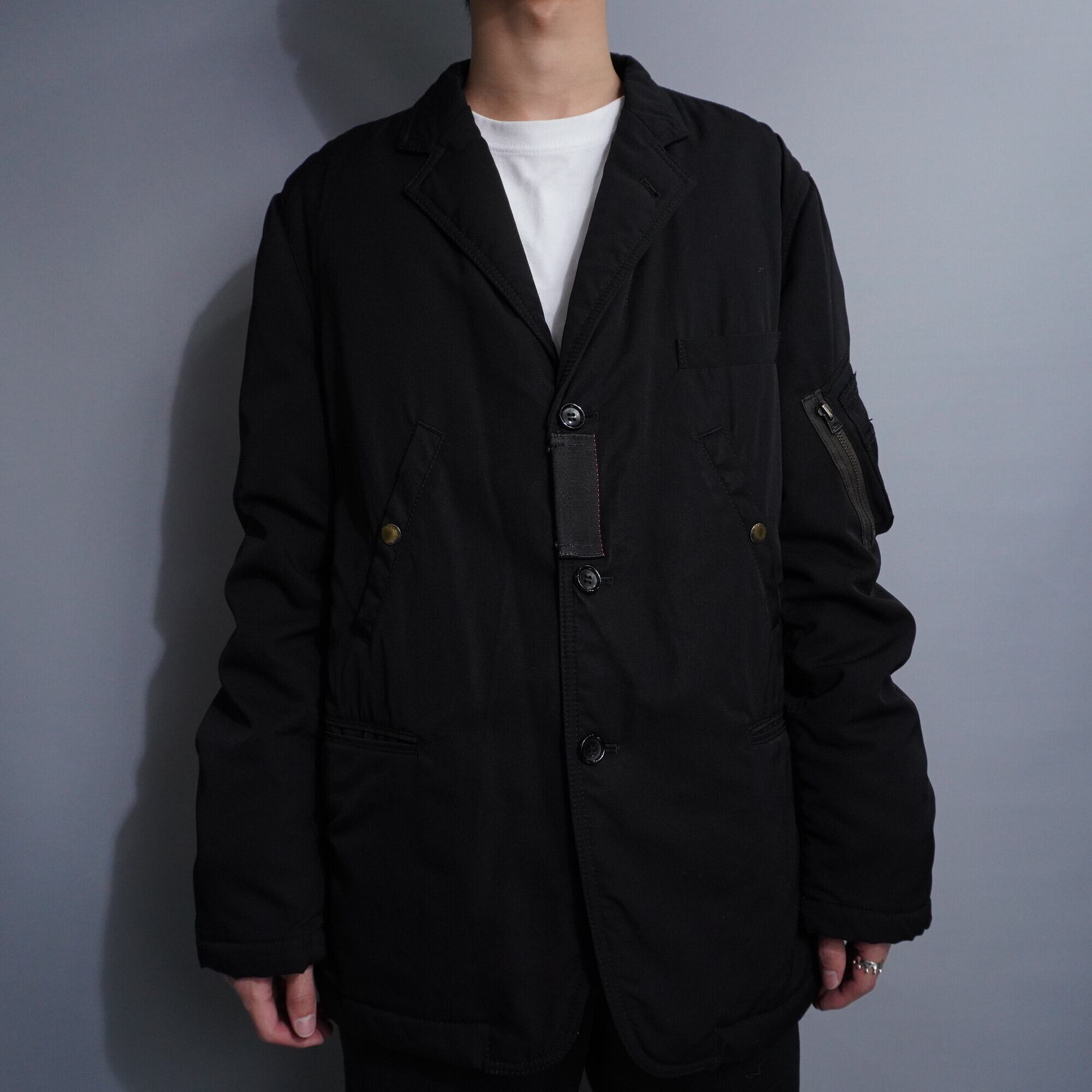 テーラードジャケットとMA-1が混ざり合ったようなディテールの中綿ジャケット。ミリタリーサンプリングを多く取り扱う当ブランドだからこそできる遊び心とギミック満載の一着。