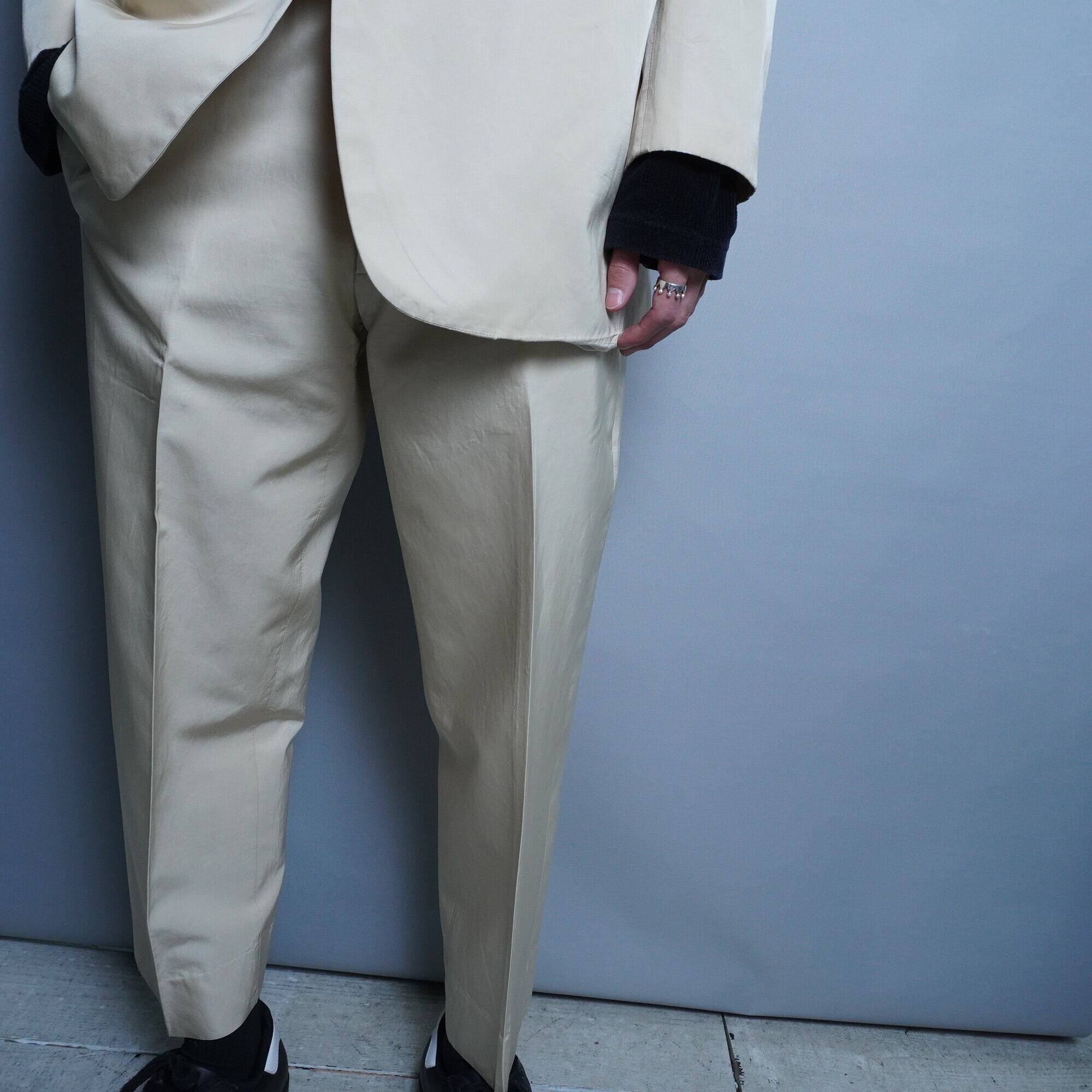 シルク×コットンのイタリア製シングルセットアップ。シルクの光沢とベージュが相まって、一際目立つスタイルになります。