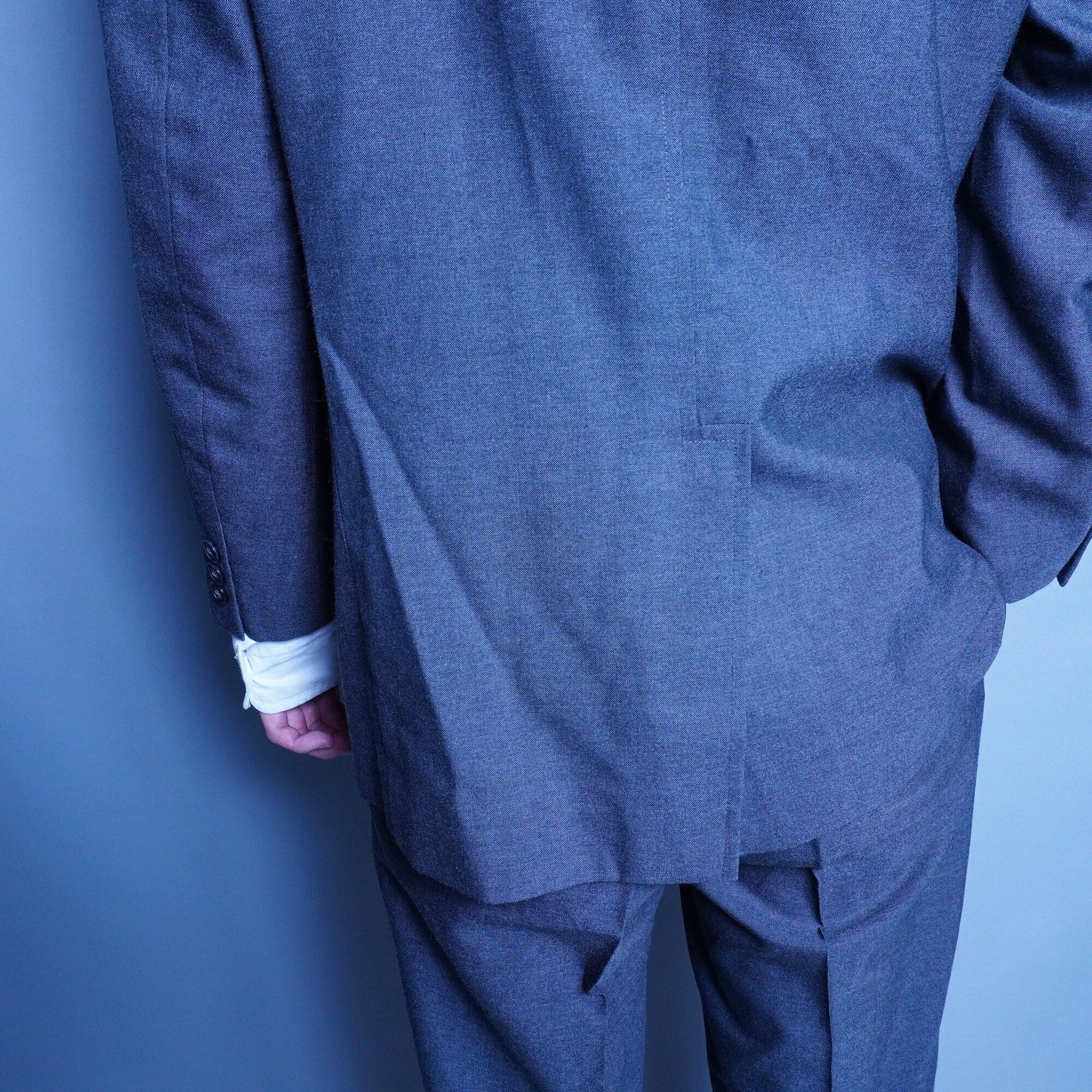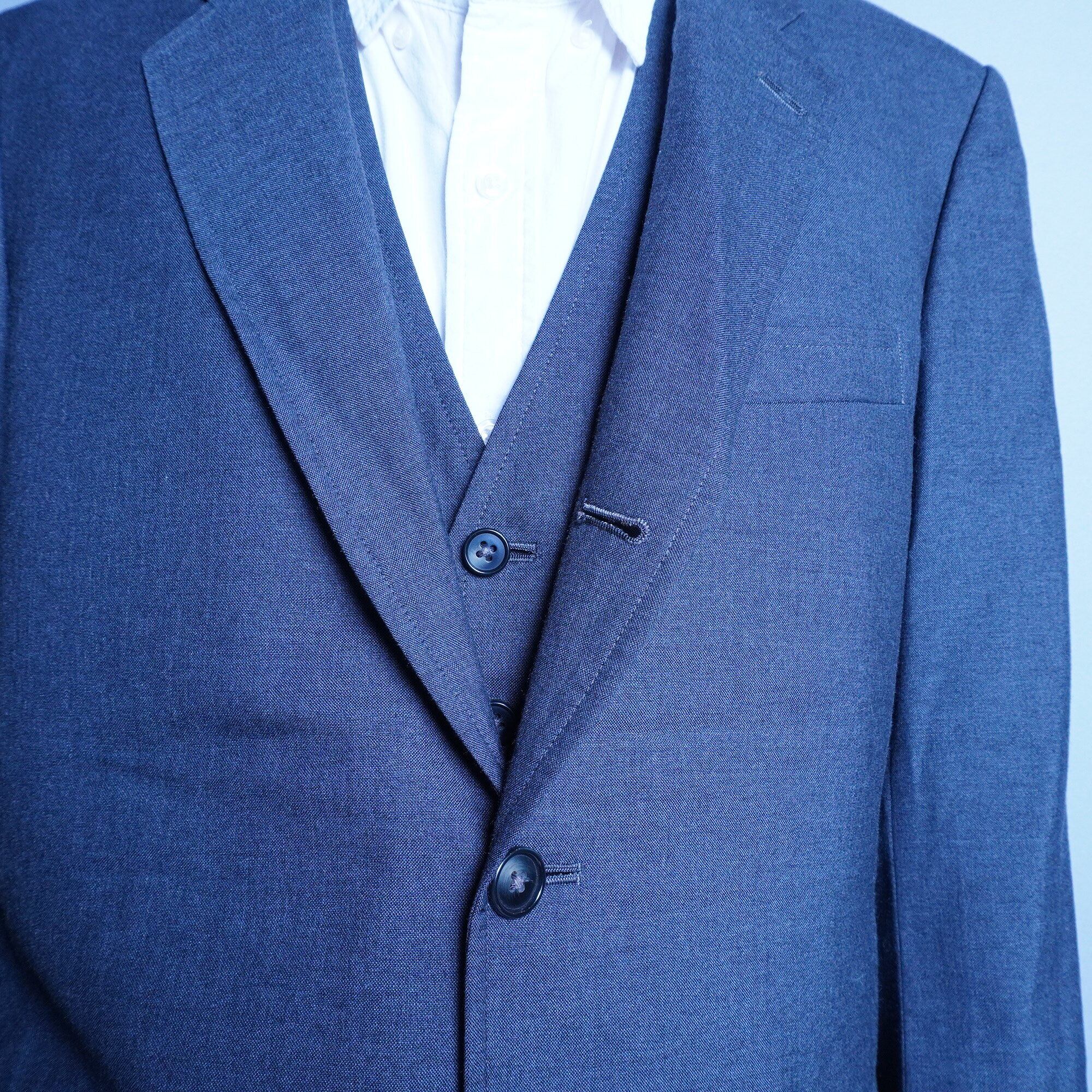 当店でも滅多に入荷しない3ピースのセットアップ。カラーも使いやすいグレーで、どんなシーンでもご利用いただけます。程よい厚みのウールが綺麗な落ち感を表現します。