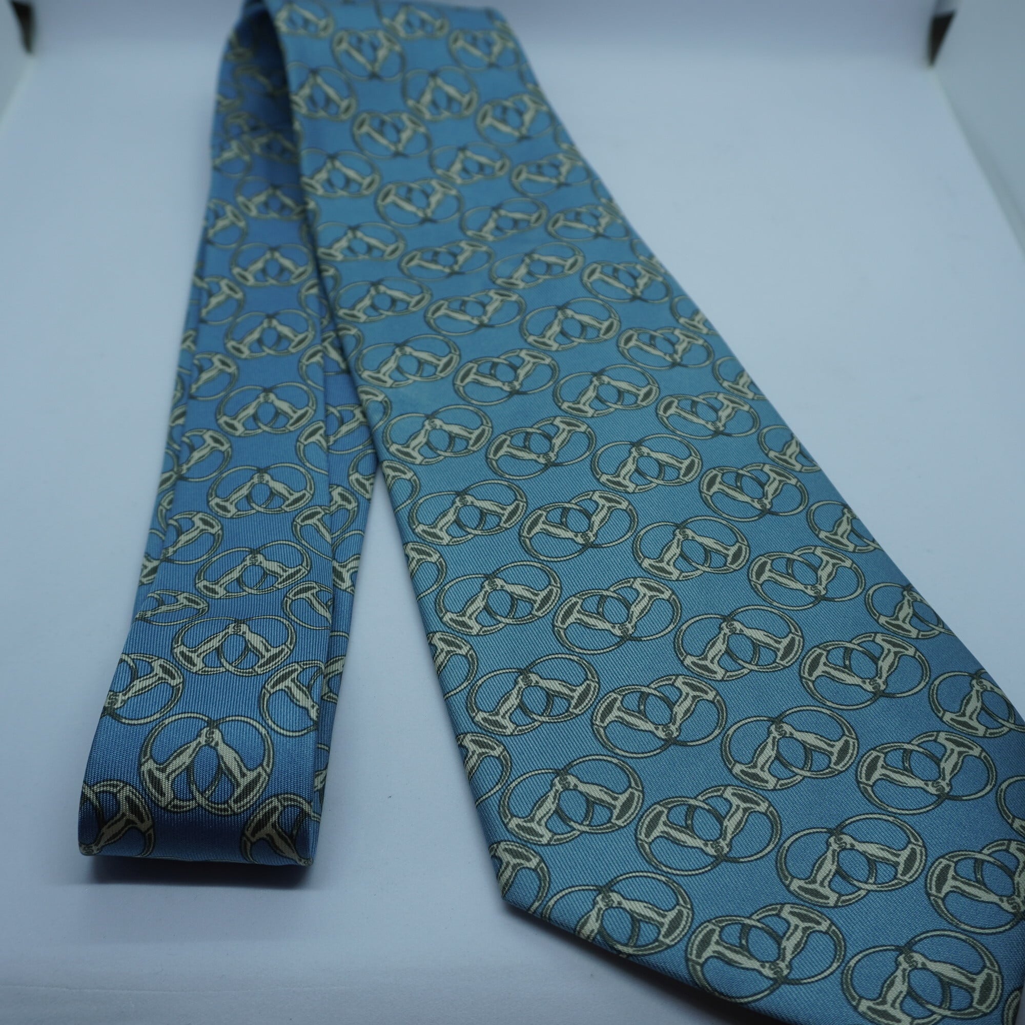 水色の下地にハンドルが重なったようなデザインの総柄ネクタイ。あまり見かけることのないカラーに珍しいデザインという、小物で差したいときに役立ちそうな一本。