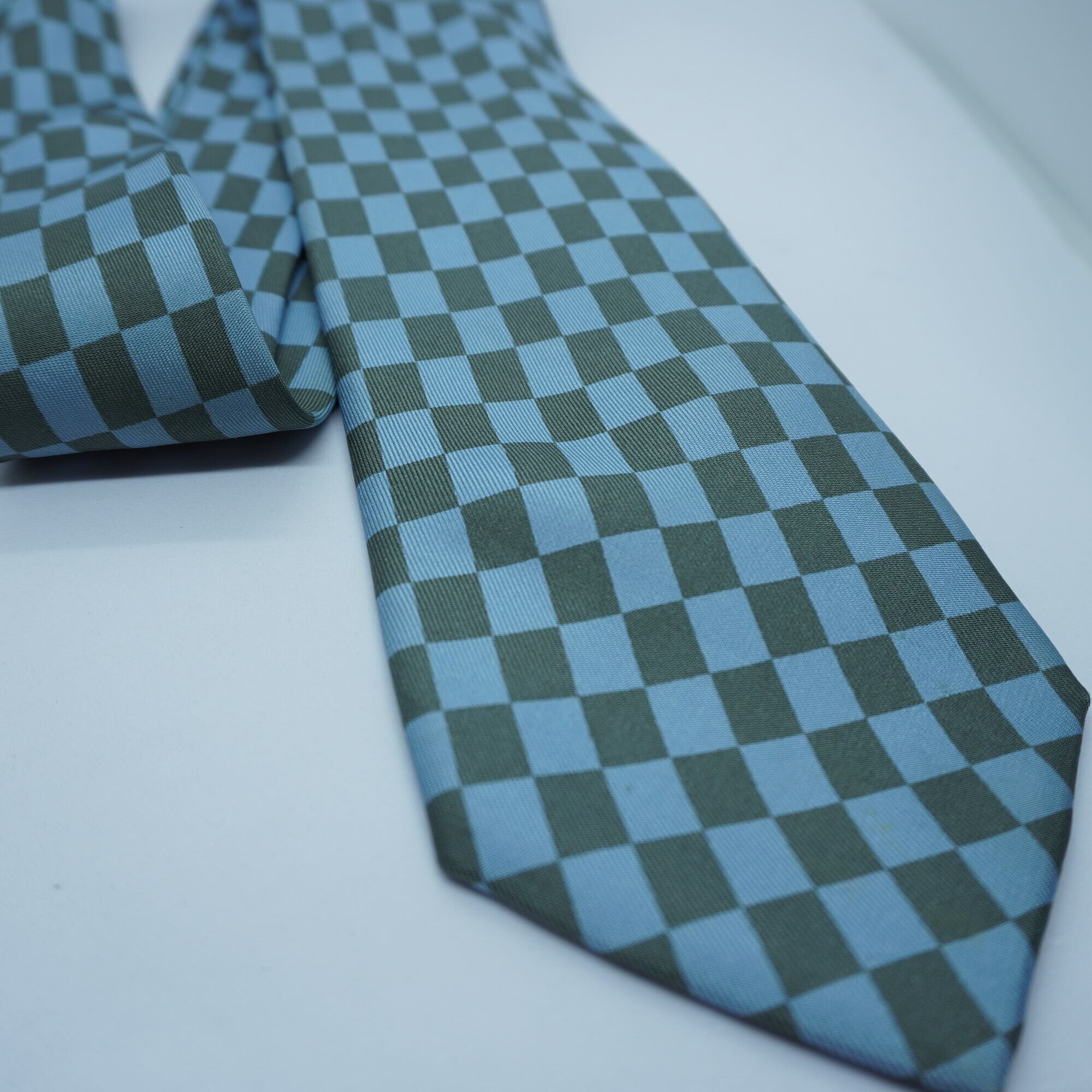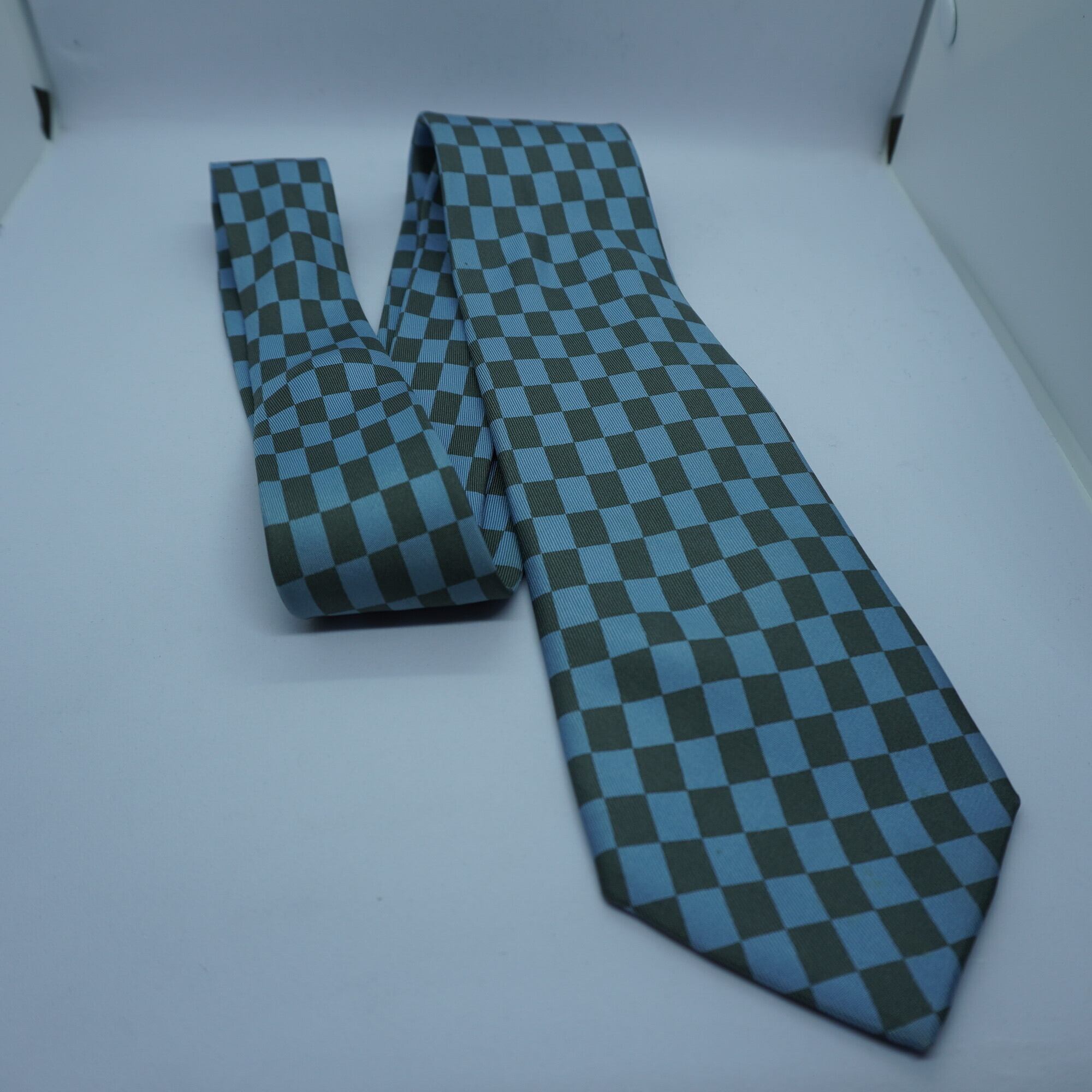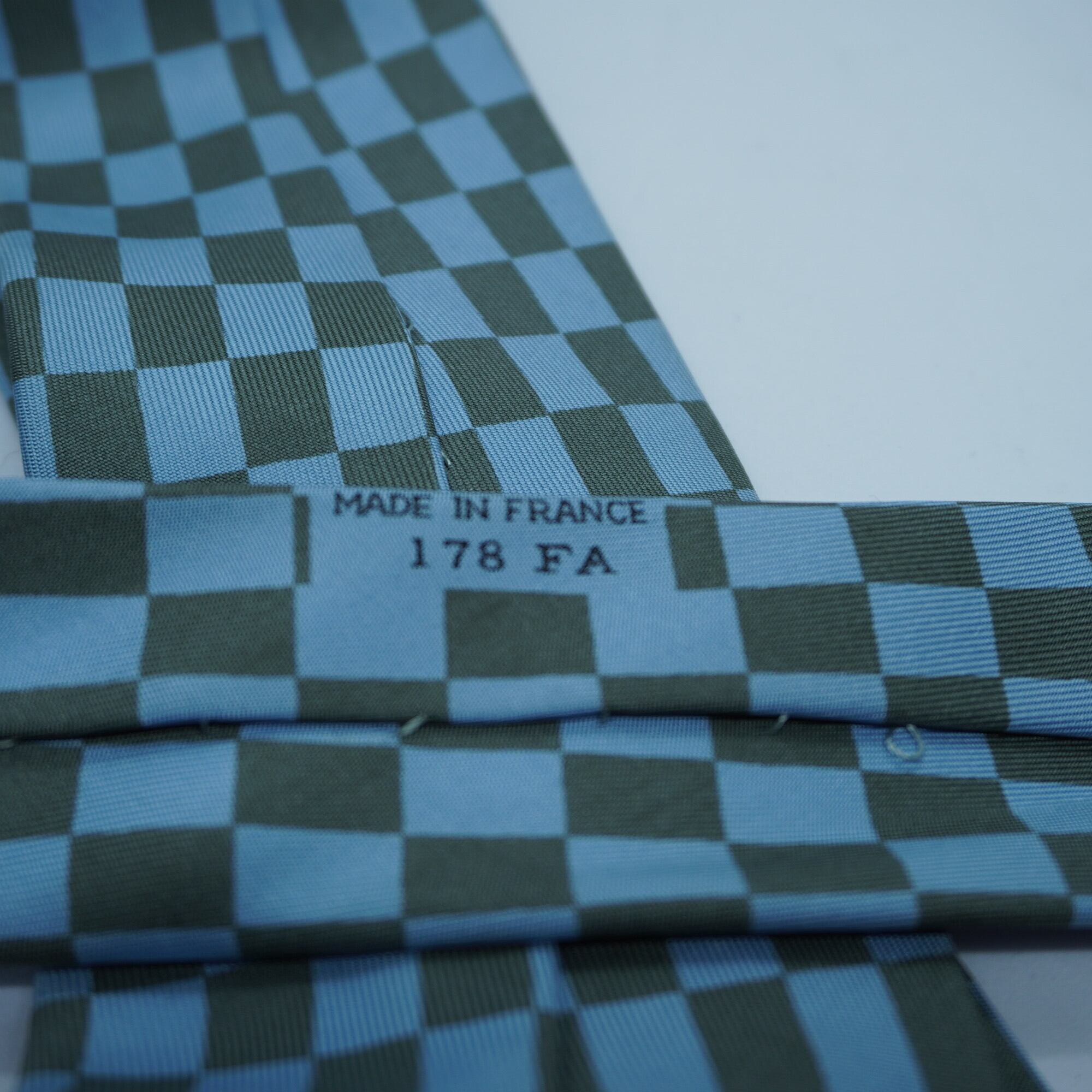 エルメスの柄ネクタイ。ブルー×ブラックのブロックチェックになっており、ホワイト×ブラックなどの普通のブロックチェックに比べ、大人っぽいシックな印象を与えてくれます。