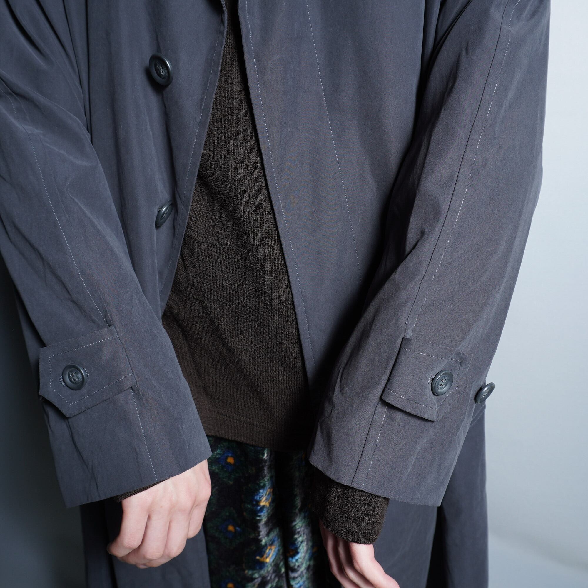 繊維の表面を薄く起毛させ、短く刈り揃えた加工であるピーチ加工が施されたステンカラーコート。しっとりとした肌触りが特徴的で、ヌバックやベロアに近いように感じる。
