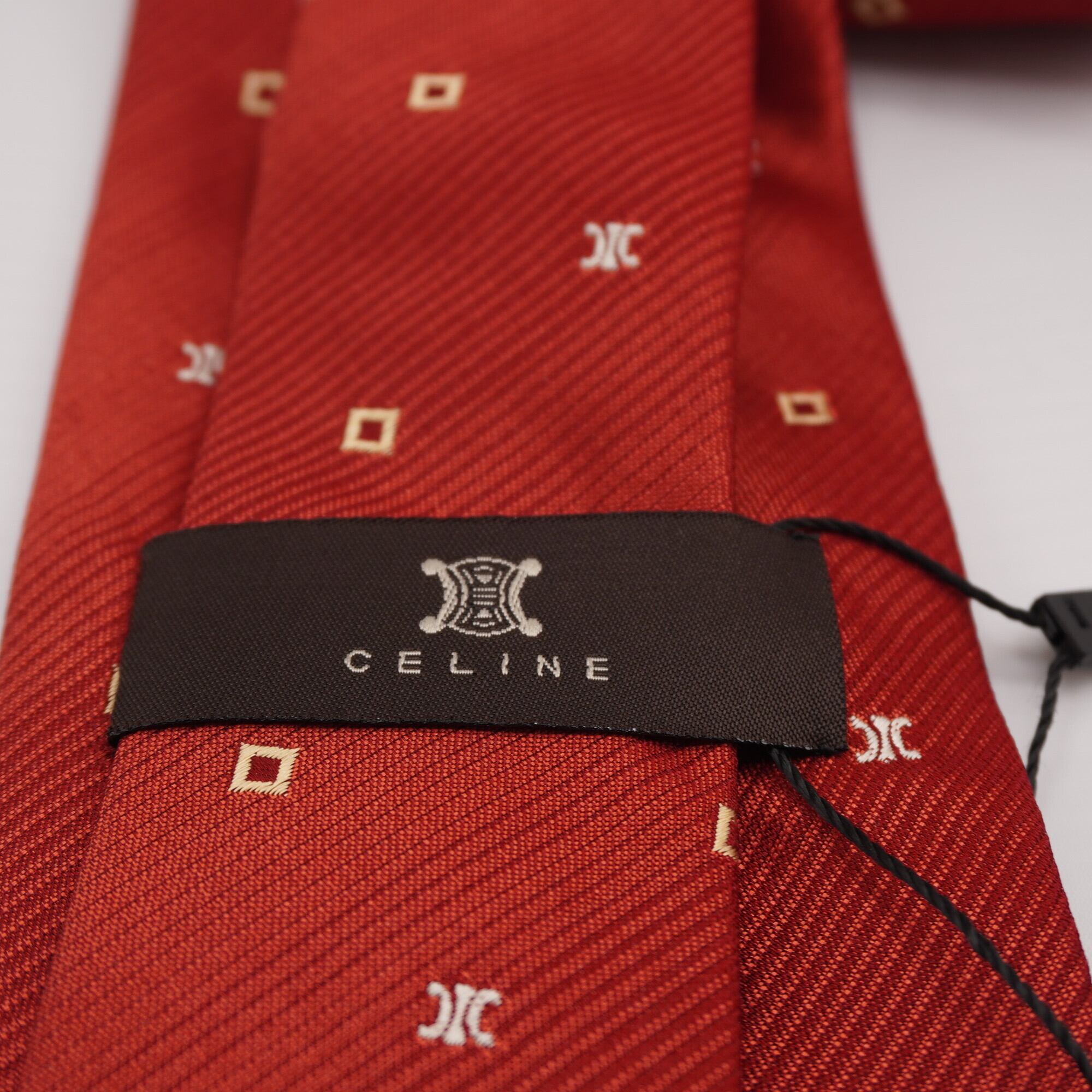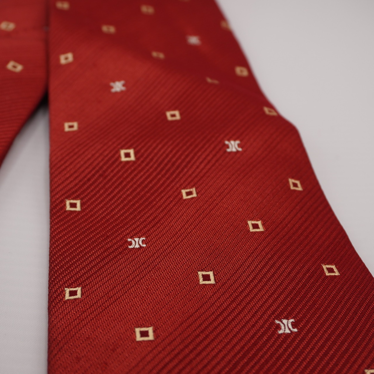 セリーヌのネクタイ。エレガントでモダンな風合いがオシャレです。光沢感のある生地にスクエアとロゴがミックスでデザインされています。