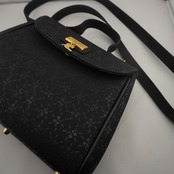 ショルダーストラップがついており、ハンドバッグ、ショルダーバッグの2wayスタイルで使用できます。コンパクトながらメインルームとサブポケットがあり、必需品の収納に便利です。軽量で丈夫な作りになっており、ブラックベースの総柄デザインでクールな雰囲気を醸し出します。