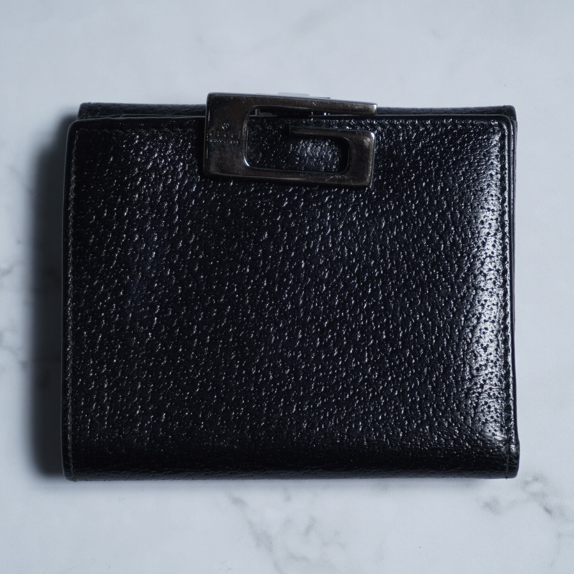 シボ感のあるブラックレザーが使われた二つ折り財布。当ブランドの頭文字であるGのモチーフが金具となり、一つのアクセントとなっている。