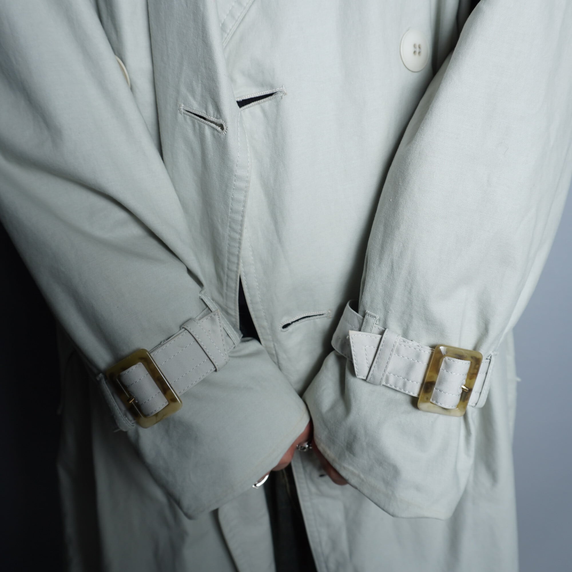 珍しいホワイトベージュカラーのトレンチコート。ベルトのバックル部分にはべっ甲のような部品が使用されている。また、裏面はペイズリー柄になっていたりと、拘りの詰まった一着となっている。