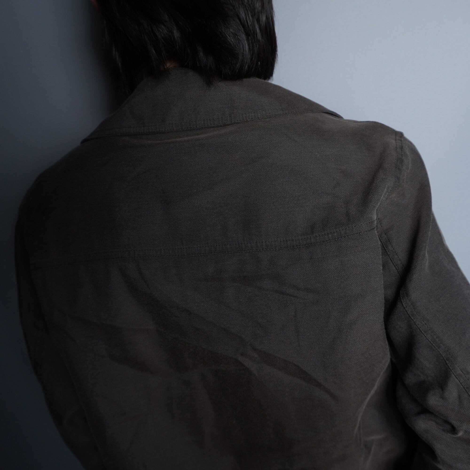 ブランド名が描かれたテープを所々にあしらったジャケット。ZIP部分のチャームがアクセントになっており、デザイン性の高い一着です。カラーリングやサイズ感からミリタリーの雰囲気も感じられます。
