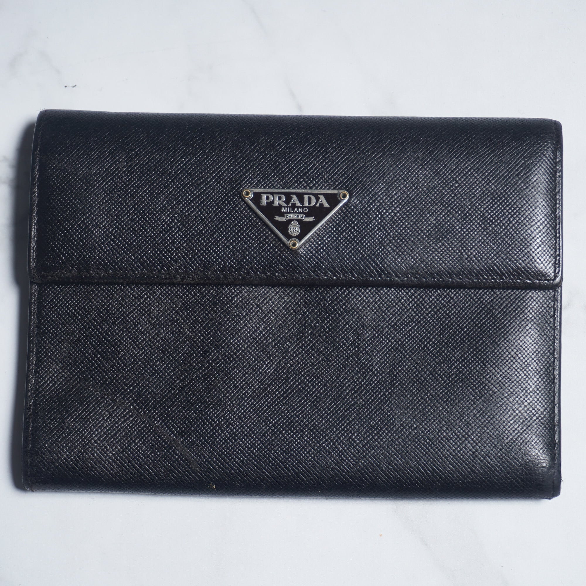 プラダの三角プレートがi印象的な折り財布。シンプルなデザインがより上質さやレザーの重厚感を引き出してくれています。